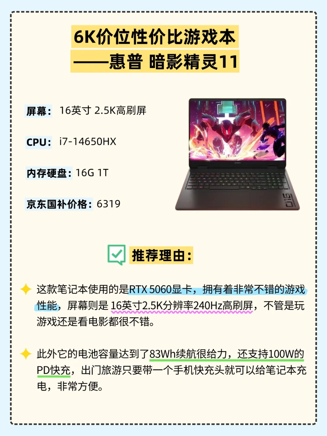 这款笔记本使用的是RTX 5060显卡,拥有着非常不错的游戏性能,屏幕则是16英寸2.5K分辨率240Hz高刷屏,不管是玩游戏还是看电影都很不错。此外它的电池容量达到了83Wh续航很给力,还支持100W的PD快充,出门旅游只要带一个手机快充头就可以给笔记本充电,非常方便。