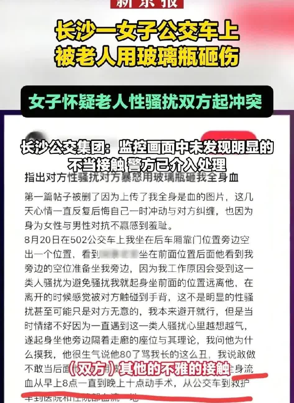 女子公交车诬告大爷性骚扰,反遭八十岁大爷怒打! 前几天北京环球影城icon诬告八岁男童性骚扰,现在又诬告八十岁大爷,就是因为诬告零成本,不用付出任何代价!现在开始无差别攻击了,越来越无法无天了! 事发8月20日长沙公交icon上,这个女人先上的公交,后来八十岁老大爷也上了公交。本来没有任何明显接触,只因为手背被碰了一下,不知道谁碰的谁!这个女人当场炸毛icon,大发雷霆,大声质问污蔑老大爷性骚扰,岂料被老大爷怼了回去,并说你长的这么丑谁骚扰你,自作多情!这个女人继续不依不饶,大爷也不惯着直接拿玻璃水瓶icon砸在女人手上,女人手仅仅只是轻微出血,双方闹的不可开交!最后警察将二人带走!公交车上监控显示二人并无明显接触,女人就是诬告大爷性骚扰! 事后女人竟然颠倒黑白,在网上发小作文,企图带节奏网爆大爷!小作文里最令人震惊一段是“这个女人被玻璃瓶砸了一下手,全身流血从早上8点一直到晚上10点。”不得不说这个女人血真多! 活该被网友怼,被众多网友骂! 真是恬不知耻,大快人心,活该被打!大爷八十岁了打人不用承担任何责任,这个女人这次受到教训了! 前几天北京环球影城诬告八岁男童性骚扰,现在又诬告八十岁大爷,就是因为诬告零成本,不用付出任何代价!现在开始无差别攻击了,越来越无法无天了!难道就没人能管她们了吗? 对此您怎么看呢?