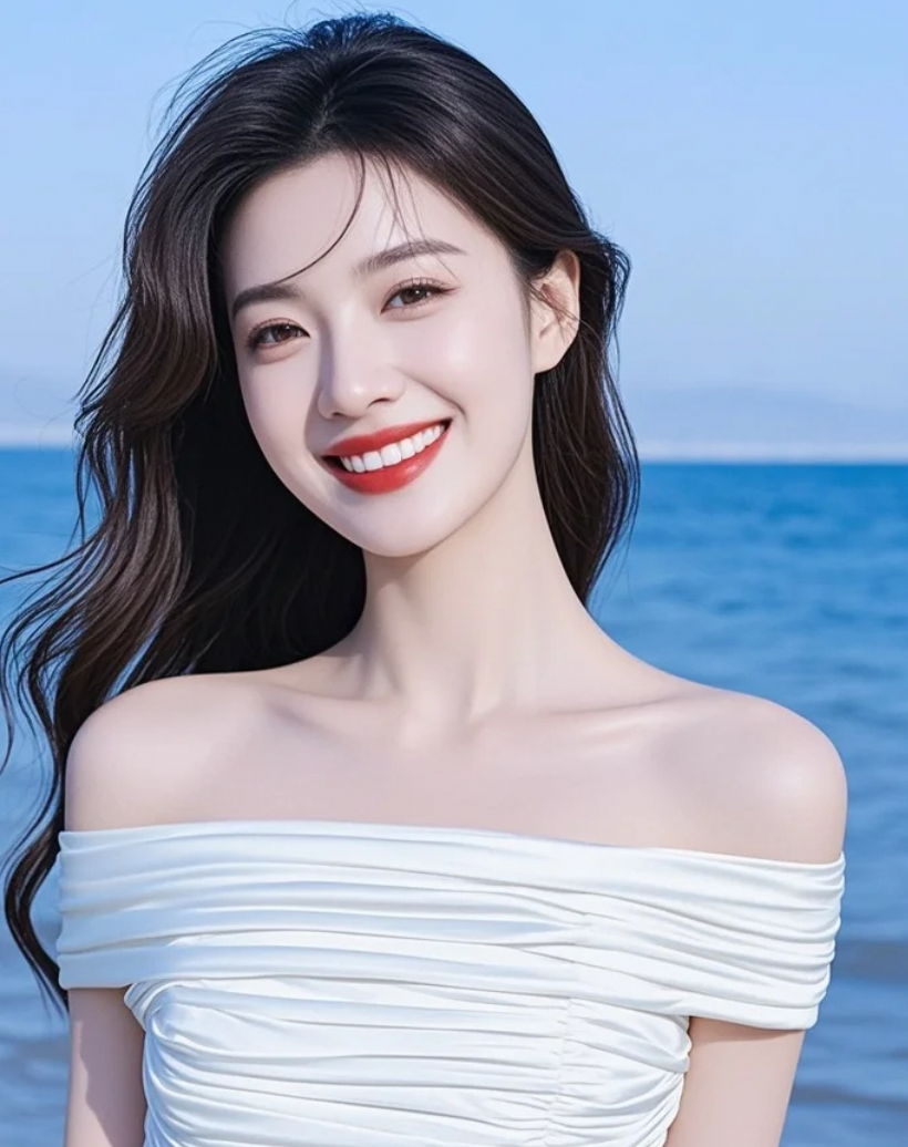 中长发如光垂落,樱桃小嘴微启,海蓝背景衬出她的高贵与秀气!
