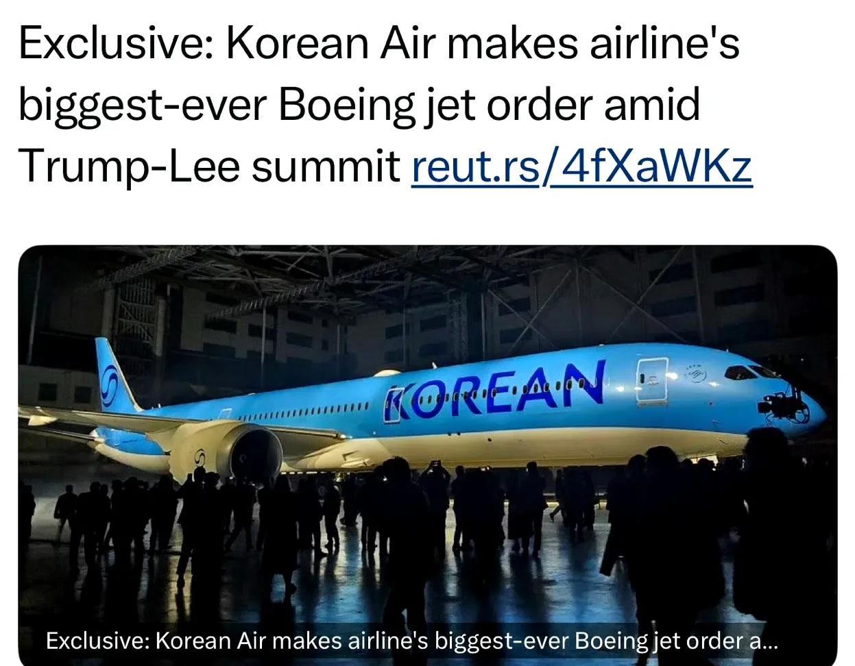大韩航空宣布:订103架波音客机、以及GE发动机、服务合同等,价值$500亿 美韩同盟对韩国来说是不可或缺的安全保障,这一点美国把韩国拿得死死的,所以,美韩关系是不对等的双边关系,在美国的棋局上,韩国始终是一个棋子。无论谁当韩国总统,都跳不出这个魔咒。 李在明当选总统后首访美国就送大礼,并不意外。