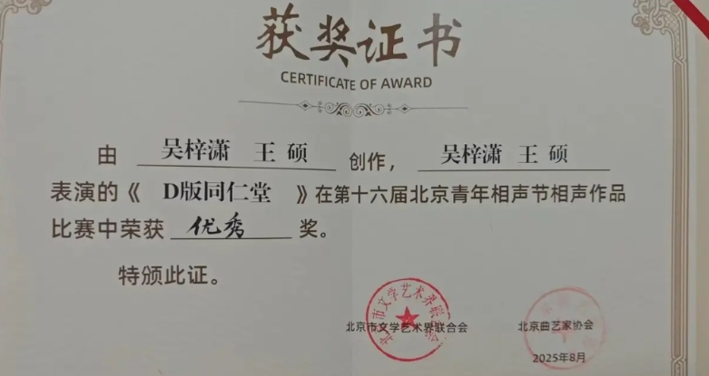李春艺的徒弟,曹云金的徒孙吴梓潇得奖了,得了一个优秀奖。 就是前几天北京曲艺家协