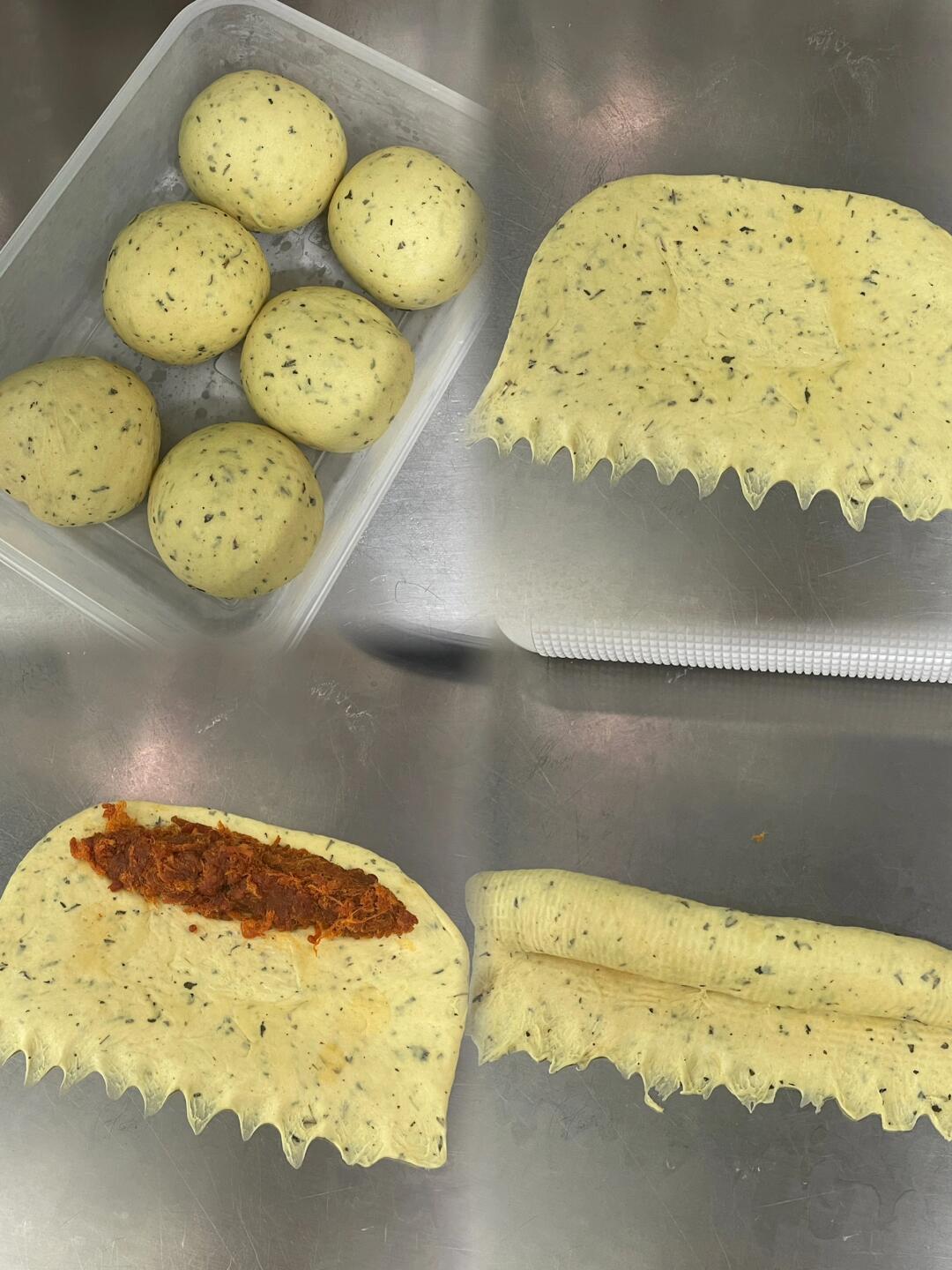 面团加了浓浓的咖喱酱and罗勒碎调味~