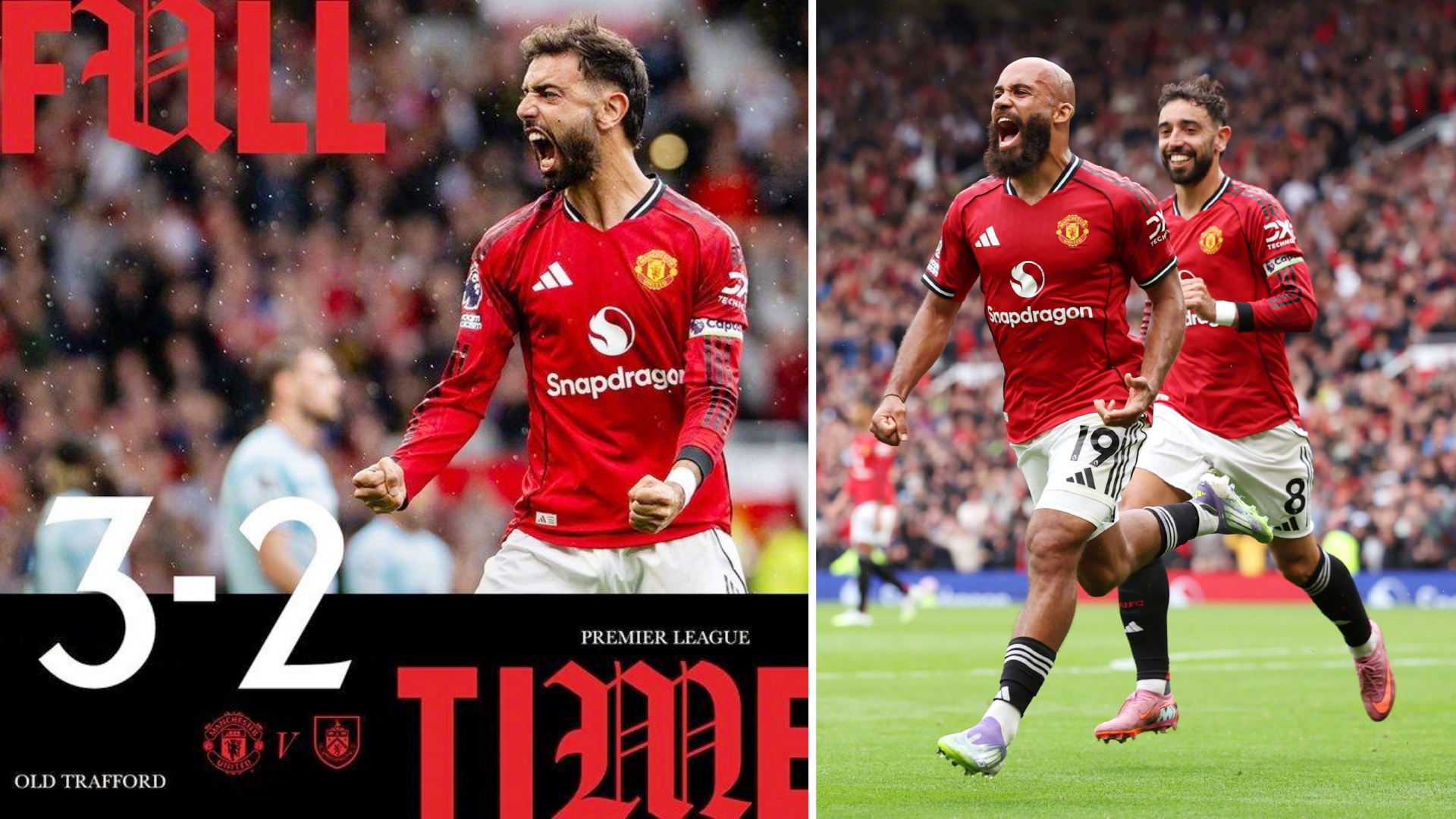 英超:曼联主场3-2绝杀伯恩利,惊险取得赛季首胜。 曼联两度领先两度被对手扳平,阿玛德补时造点,B费绝杀。
