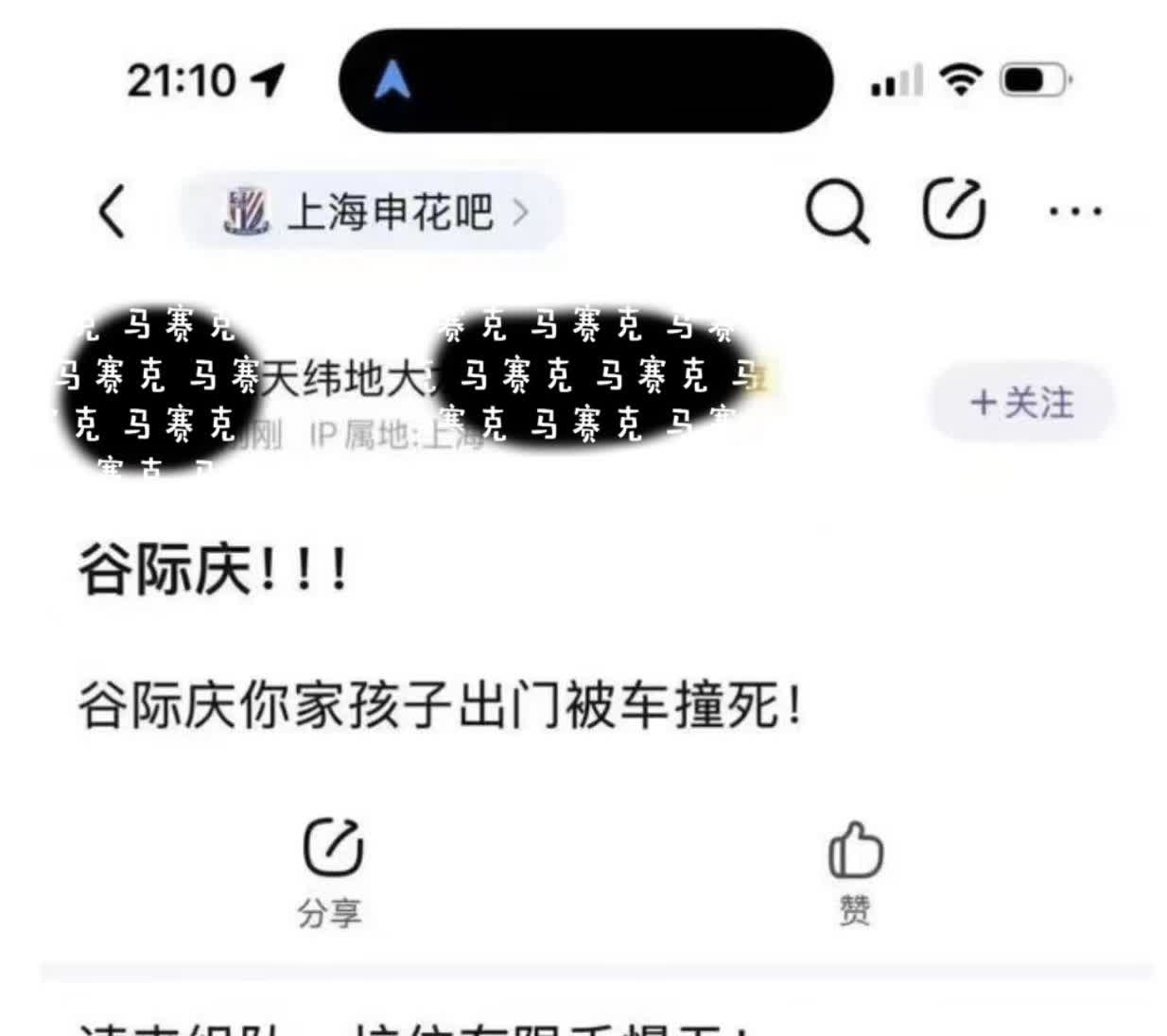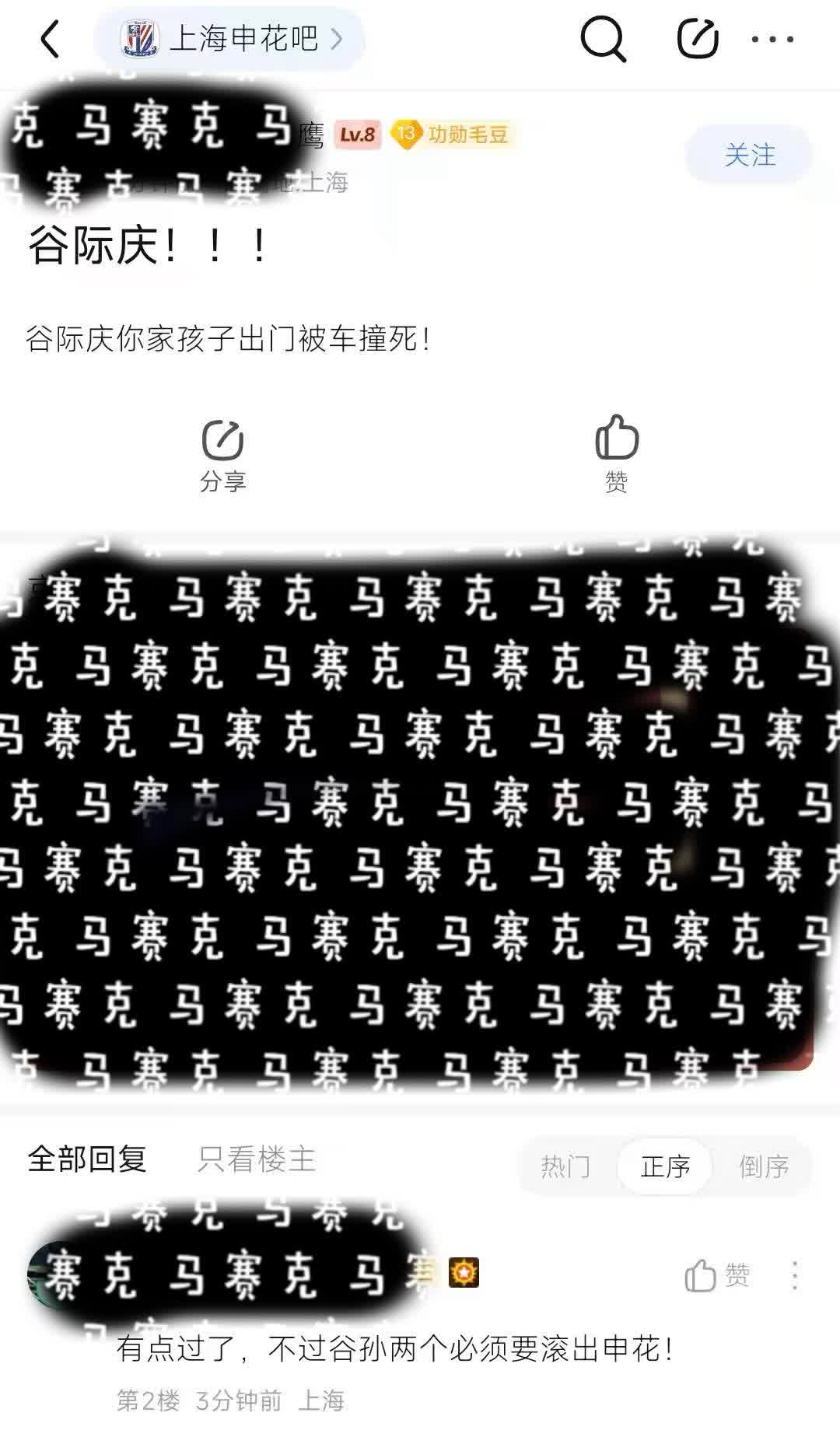 当断不断,反受其乱 申花吧里又传出了不和谐声音,不管现在是不是被删除,网络会有记忆的。这次申花球迷竟然把申花足球俱乐部谷总,兼中足联谷副理事长,兼上海足协谷副会长这样一位身兼多职的申花领头羊诅咒上,申花球迷确实太过分了,太不把谷总放眼里,太不尊重谷总了。 对于这种肆意诅咒谷总和让谷总和“孙”滚出申花的言语,图1、2(虽然我们并不知道“孙”是谁,但应该也是申花的领导吧~)这是对谷总的不公,谷总为申花夺冠不说是呕心沥血嘛,至少也是拼尽全力。申花球迷以为夺冠真的那么容易吗?所以申花球迷不可以诅咒谷总及其孩子,我们广大上海球迷强烈谴责这种不道德行为。 反过来也要向谷总进言,俗话说“当断不断反受其乱”,当初申花球迷全场谩骂武磊和武磊家人;申花球迷家长任由未成年孩子谩骂韦世豪父母;申花球迷全场辱骂天津于指导;申花主场某“记者”对客队主教练的不礼貌指责;五星记者赛场敲木鱼等等事情发生的时候,谷总你都没有公开谴责和公开处罚,结果就是“反受其乱”,我们深表同情。 希望身兼中足联、上海足协、申花董事长等足坛三个重要职务的谷总,这次一定要认真严厉的公开处罚诅咒谩骂他人的申花球迷,在申花球迷内掀起学习“五讲四美”的学习讲文明礼貌活动。发文件谁都会,要真正落到实处,需要有魄力和决心,其实并非容易。