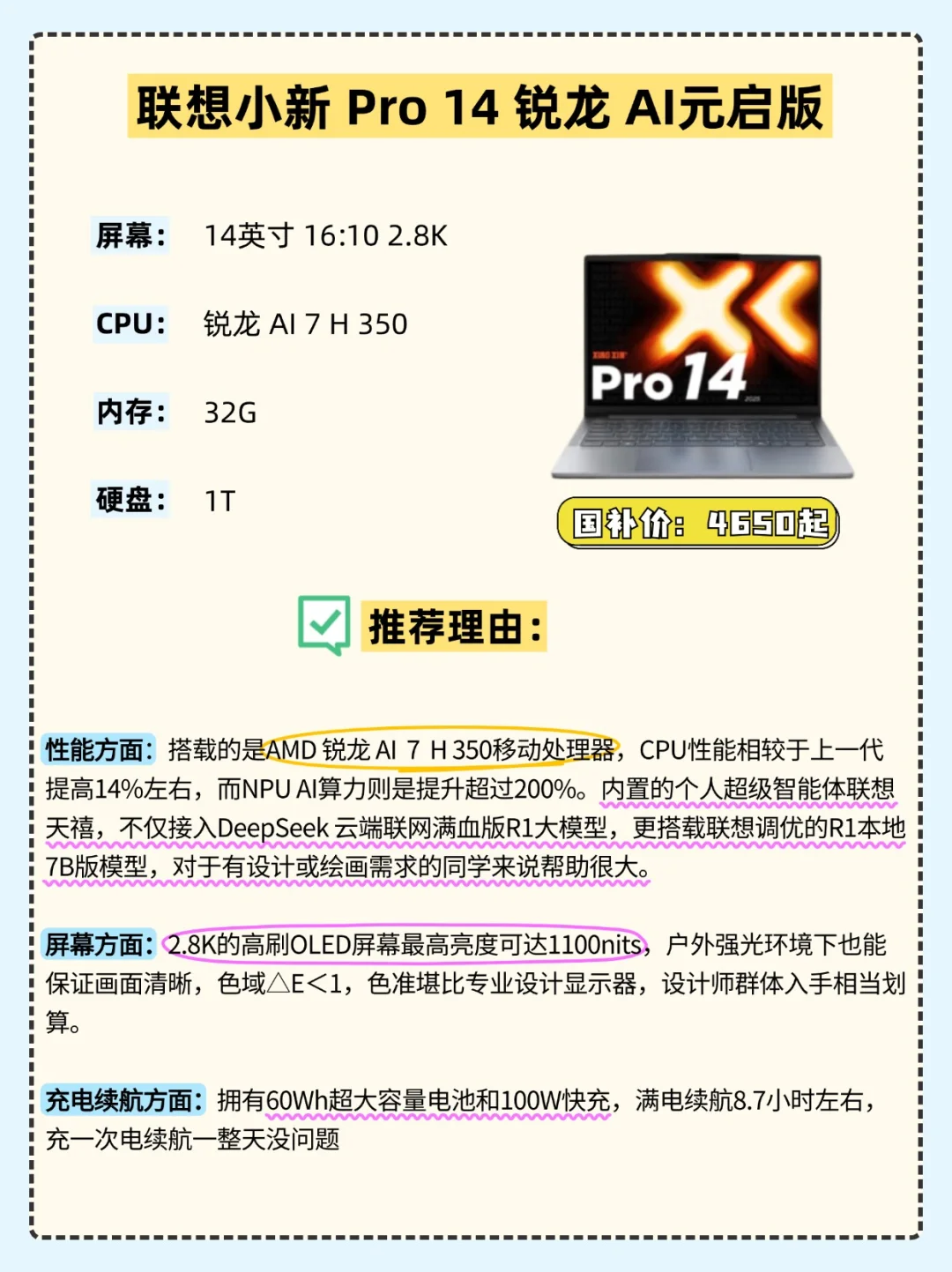 性能方面:搭载的是AMD 锐龙 AI 7 H 350移动处理器,CPU性能相较于上一代提高14%左右,而NPU AI算力则是提升超过200%。内置的个人超级智能体联想天禧,不仅接入DeepSeek 云端联网满血版R1大模型,更搭载联想调优的R1本地7B版模型,对于有设计或绘画需求的同学来说帮助很大