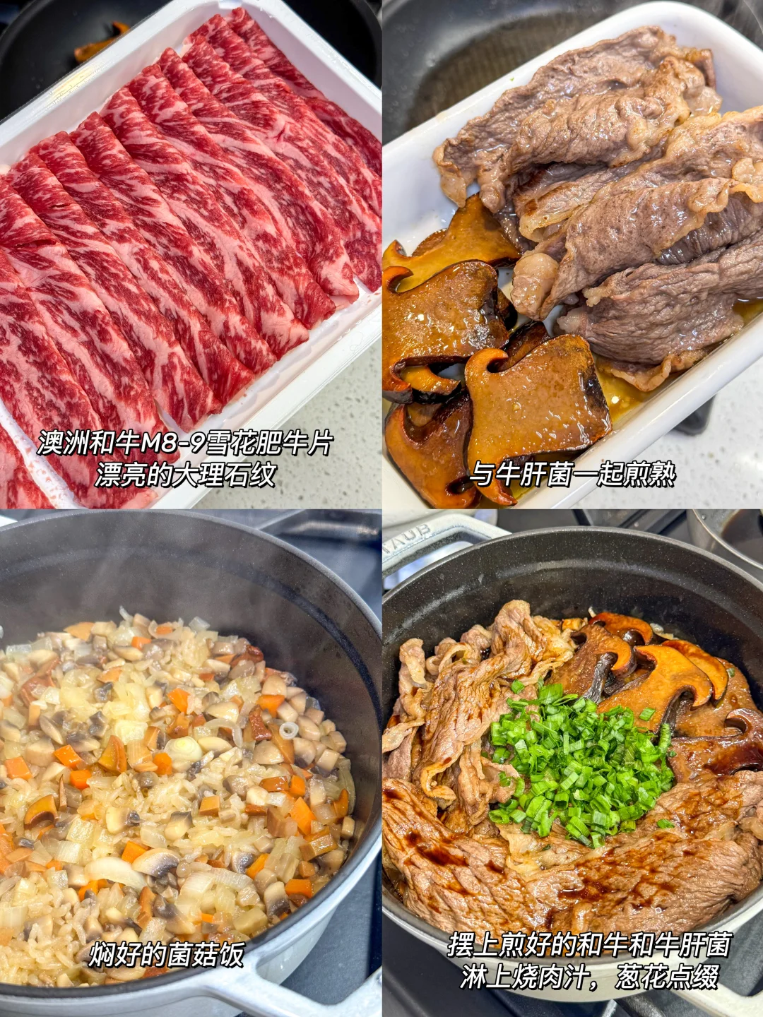 🥢澳洲和牛菌菇焖饭和清蒸蓝瓜子斑鱼,无疑是今天餐桌上的重头戏,澳洲和牛M8-9雪花肥牛片,澳洲金奖和牛,大理石般的纹理看着就诱人,搭配自制的酱汁,和牛的鲜嫩与菌菇的鲜香相互融合,简直太香了!深海蓝瓜子斑鱼,简单清蒸保留了鱼肉的鲜美,入口细腻滑嫩,贵有贵的道理,得到了家人们的一致夸赞!