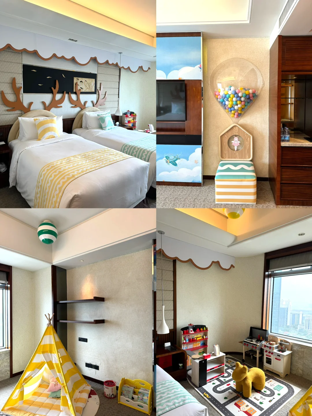 我们入住的是小厨神亲子主题房,房间以温暖的色调为主调,一进门就能感受到家一般的温馨❤房间内配备了HAPE的玩具,可以玩亲子过家家,还有小帐篷、小马凳以及床头装饰的巨型鹿角,整个空间充满了趣味性和童趣,娃兴奋到尖叫~
