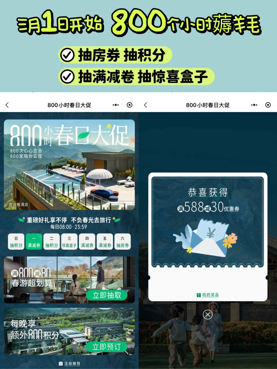 ✅ 800小时春日大促:旗下酒店房券、满减券、甚至演唱会门票都有机会可以抽取。