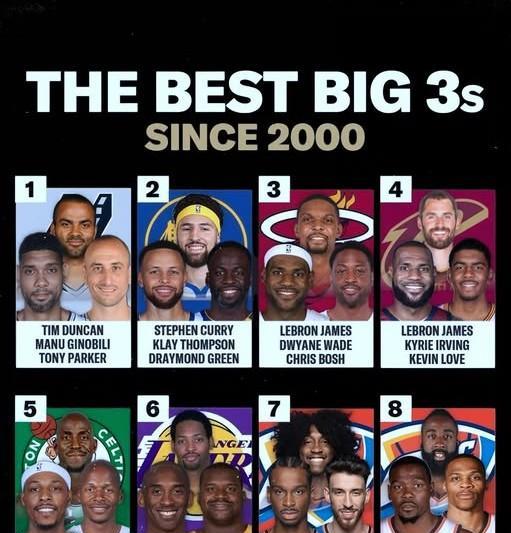 2000年以后nba最佳三人组合(三巨头)排行榜前八#篮球历史排名# ,詹姆斯厉害了,两次上榜 第一名当仁不让的马刺邓肯,帕克,吉诺比利,无可非议的第一 第二名勇士的库里,汤普森,格林 第三名热火的詹姆斯,韦德,波什 第四名骑士的詹姆斯,欧文,乐福 第五名凯尔特人加内特,阿伦,皮尔斯 第六名湖人的科比,奥尼尔,霍里 第七名雷霆青年三才俊,亚历山大,霍姆格伦,威廉姆斯 第八名雷霆的杜兰特,维斯布洛克,哈登 詹姆斯个人两次上榜,雷霆球队两次上榜,感觉第八雷霆老三少是凑数的,因为只有他们哥仨没有总冠军,其余七组都有总冠军,大家怎么看?还有比这八组更强的组合吗?