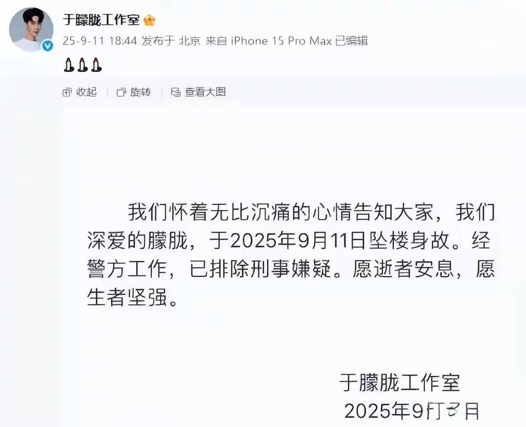 人不是老了才会死亡,而是随时都有可能发生意外。 当时看到这样的文,我是不相信的,因为没有官方证实,我猜想应该是那些人为了流量而所造谣的,不可能会有这样的事。 当时我还在心里想着,那些人为了流量真的是拼了,真的什么话都胡说八道。 虽然我心里这样想,但又怕是真的,因为有一些事也不是空穴来风,但希望是假的吧,为什么说希望是假的呢? 因为于朦胧是我很喜欢的一个男演员,他在三生三世十里桃花扮演的白真上神,是我最喜欢的一个角色,当时看这部电视剧的时候,我还说这是整部电视剧长得最好看的一个男人。 这么好看的一个男人,怎么会有人说他坠楼身亡了呢?我不相信,肯定是那些人为了流量而编造的,因为也没有得到官方的证实,反正我是不信的。 虽然我说不信,但心里又害怕,因为我真害怕是真的,反正整个下午都在想这件事,神情恍恍惚惚的,只希望这件事是假的。 可就在晚上7点多钟的时候,我又再一次刷到了关于于朦胧坠楼的消息,这一次是工作室发出来的,证实人已经坠楼身亡。 当时看着已经被证实的消息,我心里好难受啊,我也不知道为什么会这么难受,明明人家是明星,明明我跟人家都不认识,可是怎么会那么伤感呢?难不成是我也害怕死亡吗? 不知道明星于朦胧坠楼的原因,但只知道他现在已经不在了,他还那么年轻啊,才30多岁呀,正是大好年华的时候,怎么就不在了呢? 反正从今晚这个消息被证实以来,我的心里一直都是很难受的,一个那么好看的男人,一个事业那么成功的男人,怎么就这样离开了呢? 看着已经被证实的消息,我想起了之前在网上刷到那些已经过世的明星,比如周海媚,比如大S……那时我都是看着她们电视长大的呀,可是生命这个东西真的不好说,有的人轻轻松松活到100岁,可有的人在大好年华就走了,那些走的人是因为钱吗?不是! 通过今天被证实,于朦胧已经坠楼身亡的消息,我忽然觉得死亡并不是说老了才会死,不是说一定活到七八十岁才会死,而是随时都有可能发生意外,有可能今天还笑呵呵地活着,但是明天谁又知道发生什么呢? 这个世界上有很多人,很多事都说不清,命也说不清,只能说在活着的时候就好好珍惜生活,好好体验这个世界,毕竟每个人就来这世界一遭,体验完了,也就回去了。 说实话,我从头到尾都没有想蹭这个人血馒头,只是给我的感慨太深了,真的太深了。