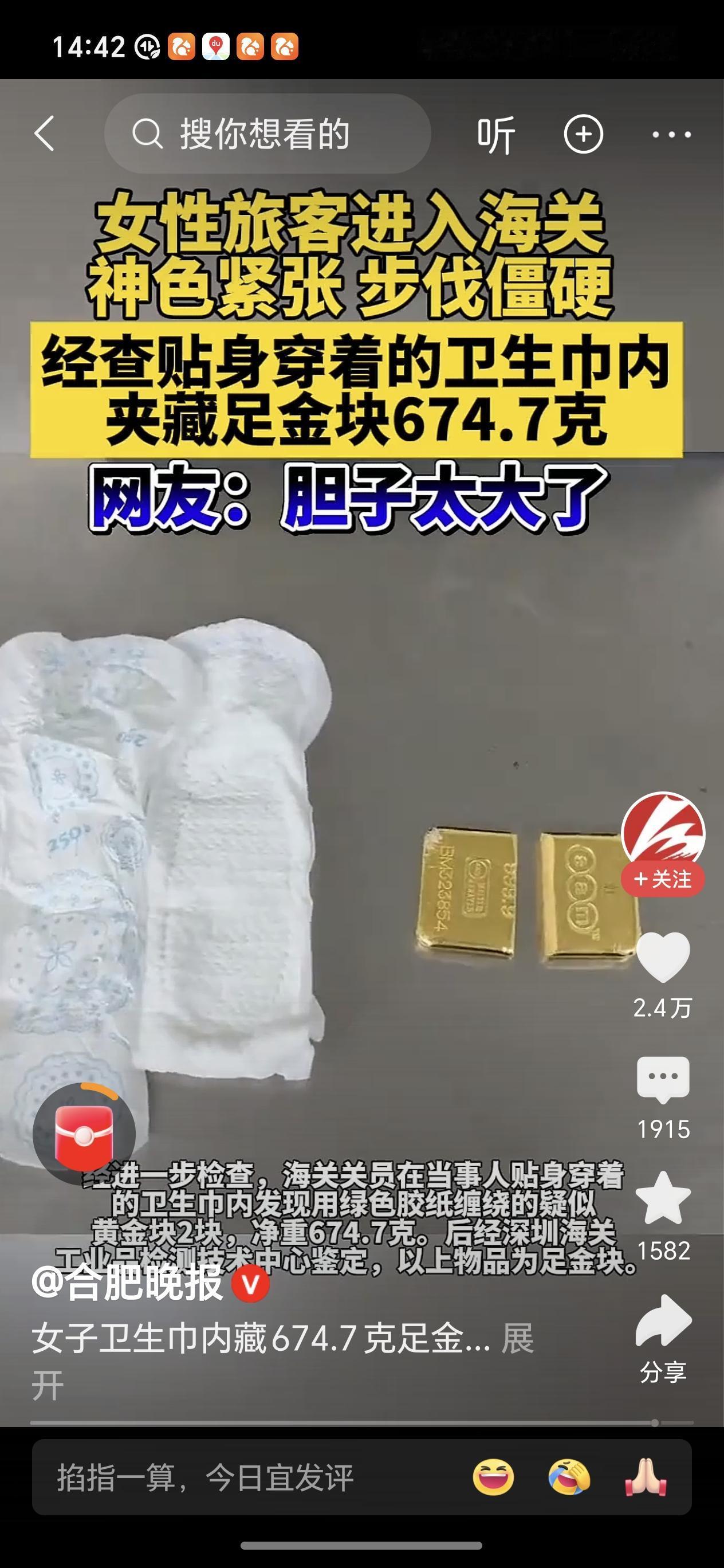 女子卫生巾内藏674.7克足金被查近日一名女性旅客走进深圳罗湖口岸,神色慌张,步伐僵硬。这女子的不正常被海关人员发现。经过仔细的检查,女子贴身穿着的卫生巾内藏有金块674.7克。这可能是最贵的卫生巾了[捂脸] 女子携带这么多黄金居然没有报关,据说超过50克黄金就必须申报,这女子胆子太大了。 天网恢恢 ,疏而不漏,这种拙劣的伎俩在现在的高科技下无所遁形。这女子太可笑了,别说藏私处,无论你藏哪里,都可以查出来。