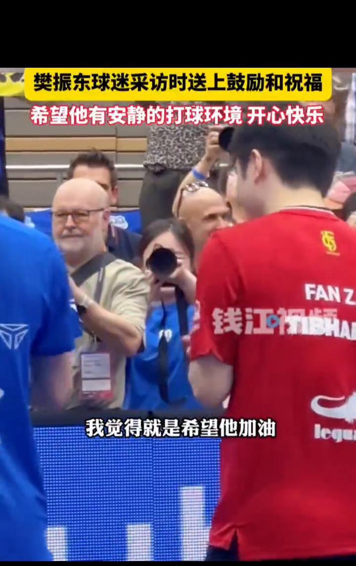 樊振东球迷采访时送上鼓励和祝福,希望他有安静的打球环境,开心快乐。 钱江视频。 这位球迷表示自己从2016年就开始关注樊振东,当年就在德国看了他的比赛。 我觉得他的坚韧、不屈服、不放弃的意志其实是非常吸引人的,我觉得很幸运能够这么近距离地观看樊振东的比赛,因为我是他的忠粉。在这种情况下,我觉得就是希望他加油,有一个安静的打球环境,希望他特别的开心快乐。