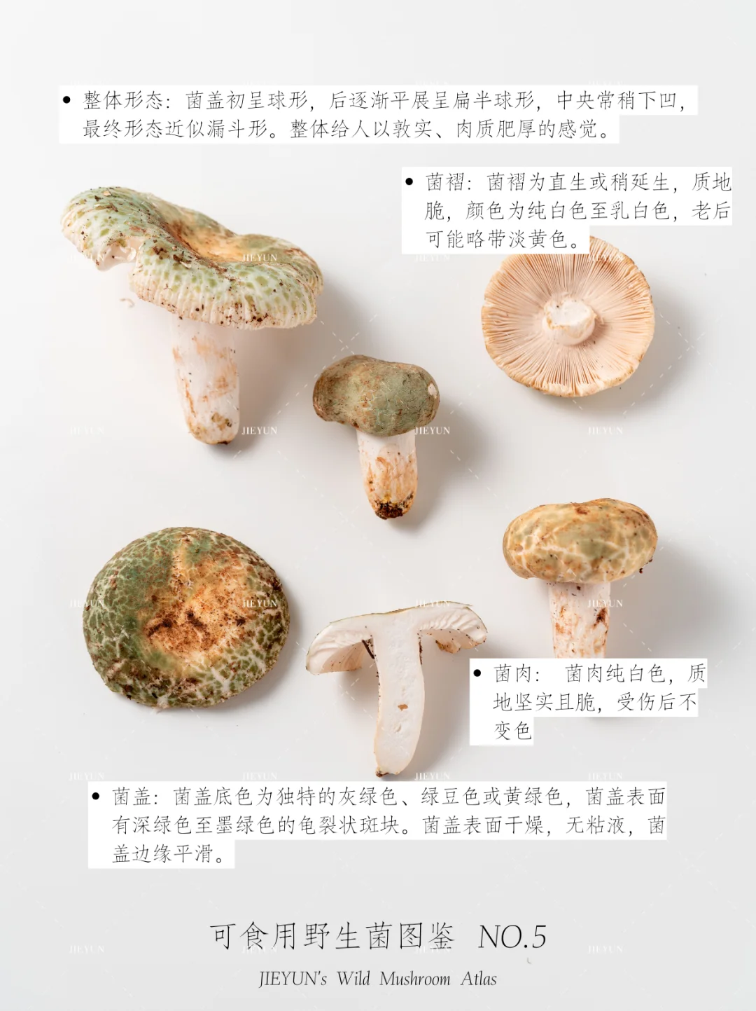 菌盖: 菌盖直径通常在5至12厘米之间,较大个体可达15厘米。其最显著的特征是颜色与纹理。菌盖底色为独特的灰绿色、绿豆色或黄绿色,色泽通常不均匀,中央颜色更深,可呈深绿色或褐绿色,向边缘渐变为浅绿色甚至近白色。另一个至关重要的识别特征是菌盖表面的纹理,它覆盖有深绿色至墨绿色的龟裂状斑块或颗粒状疣突,这些斑块在浅色底色的映衬下形成鲜明的“癞斑”或“裂纹”图案,状如龟背的花纹。菌盖表面干燥,无粘液,菌盖边缘平滑,老后可见不太明显的短条纹。