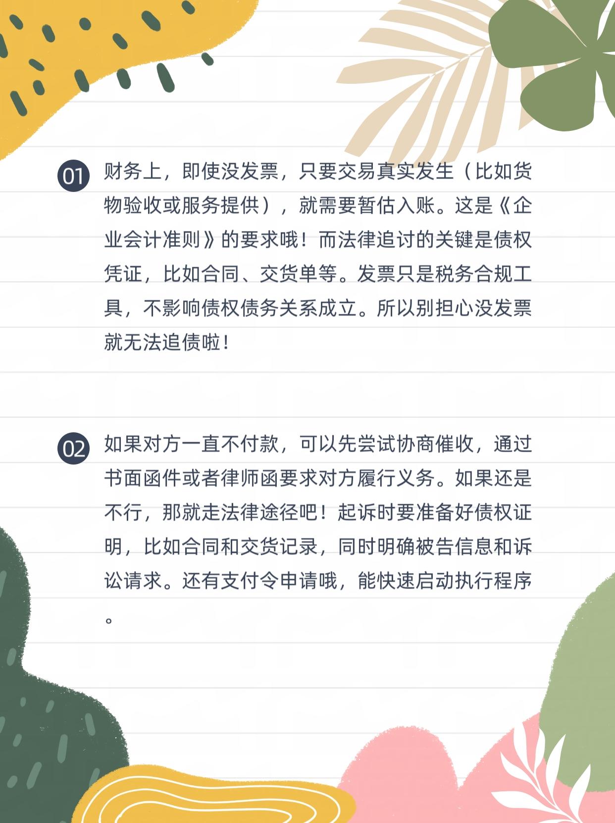 未开发票也能追讨欠款。在民事诉讼中,证据形式多样,如合同、收据、送货单、对账单、微信聊天记录、通话录音等皆可作为欠款存在的佐证,即使没有发票,只要有这些相关证据,能够证明存在合法有效的债权债务关系,就可以通过协商、申请仲裁或向法院起诉等合法方式追讨欠款。追回欠款的有效方法 如何追回欠款 不还钱的老赖 欠钱不还如何起诉