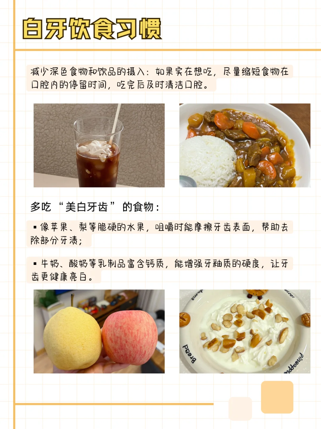 [樱花R]减少深色食物和饮品的摄入:如果实在想吃,尽量缩短食物在口腔内的停留时间,吃完后及时清洁口腔。