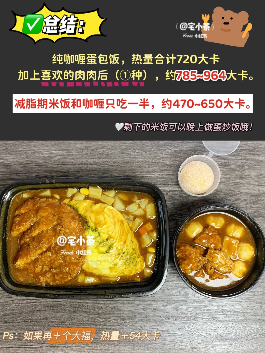 一份咖喱蛋包饭,热量合计720大卡,加上喜欢的肉肉后(①种),热量约785~964大卡。