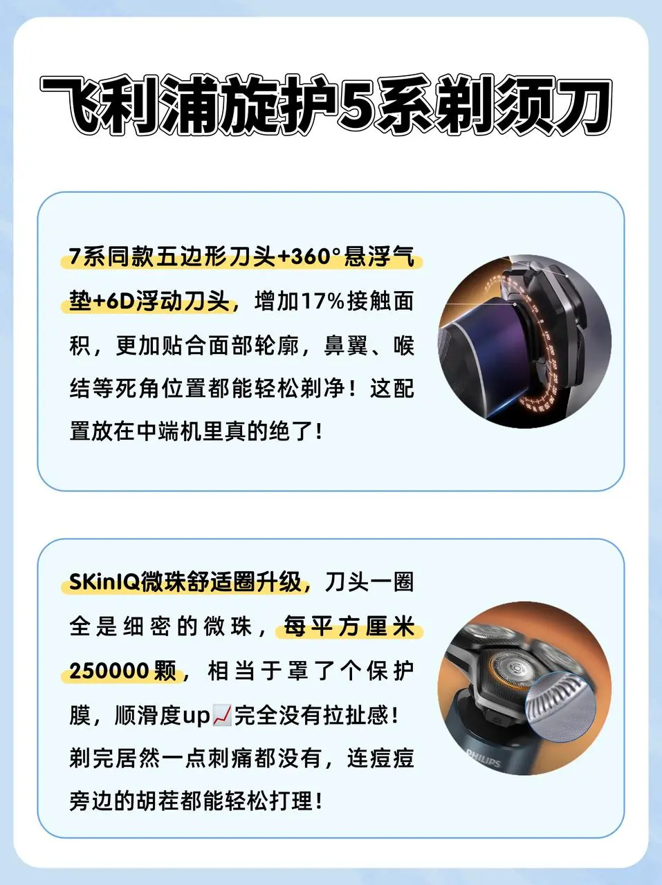 👉🏻7系同款五边形刀头,这配置放在中端机里真的绝了!以前用圆形刀头总漏胡茬,下巴棱角和脖子曲线根本贴不住,得反复刮好几次。而这款采用五边形刀头+360°悬浮气垫+6D浮动刀头,增加17%接触面积,更加贴合面部轮廓,鼻翼、喉结等死角位置都能轻松剃净!