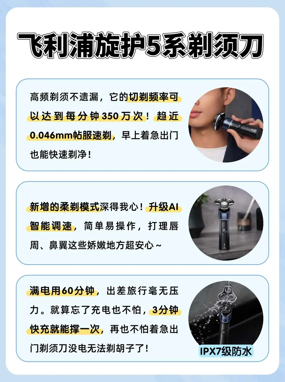 👉🏻高频剃须不遗漏,它的切剃频率可以达到每分钟350万次!趋近0.046mm帖服速剃,早上着急出门也能快速剃净!