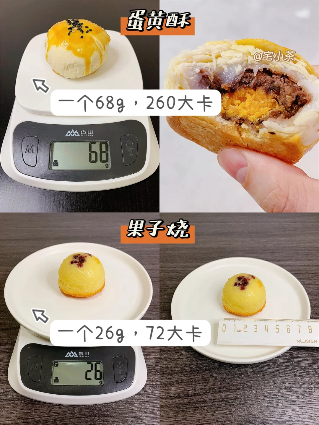 蛋黄酥:一个68g,260大卡