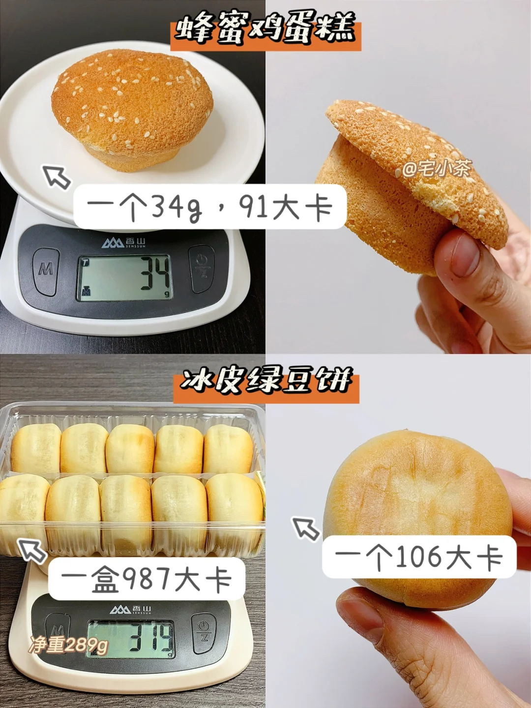 蜂蜜鸡蛋糕:一个34g,91大卡