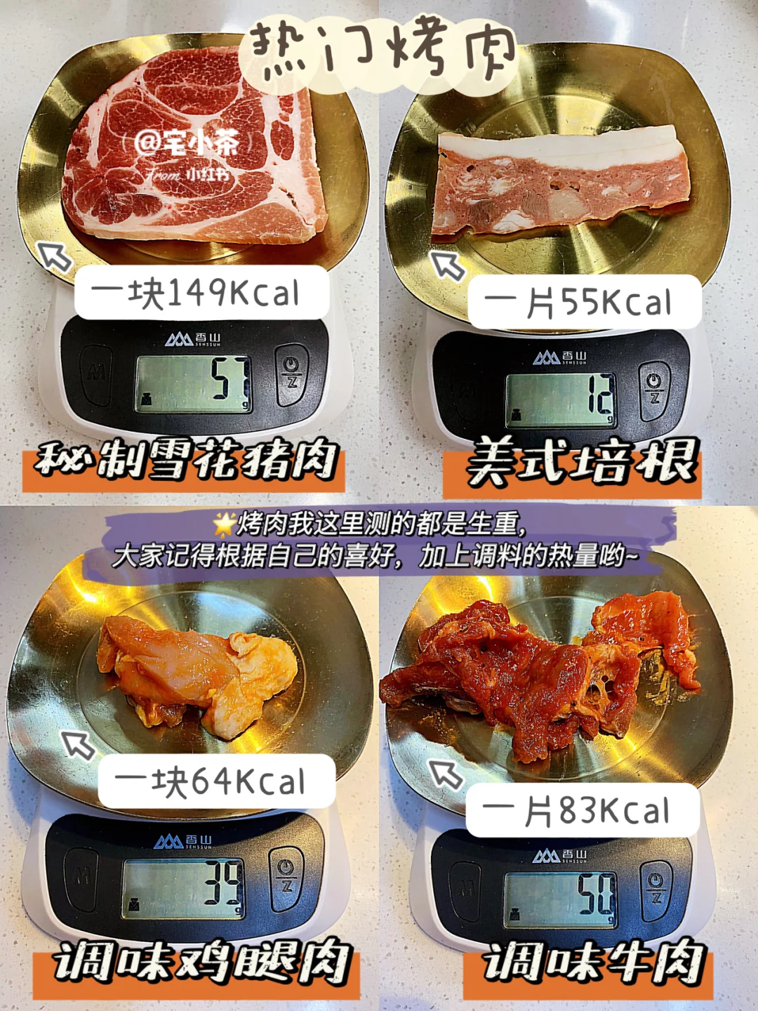 ‼️注意啦!烤肉我这里测的都是生重,大家根据自己的喜好,加上调料的热量哟~