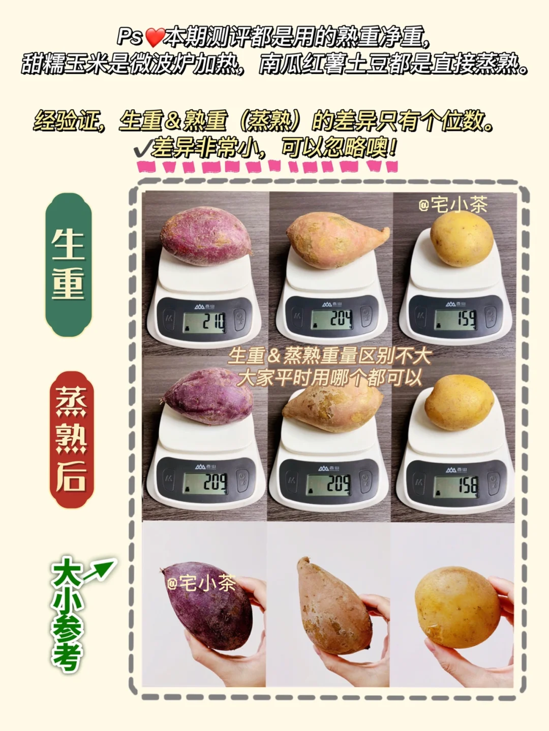 PS:本期测评都是用的熟重净重,甜糯玉米是微波炉加热,南瓜红薯土豆都是直接蒸熟。