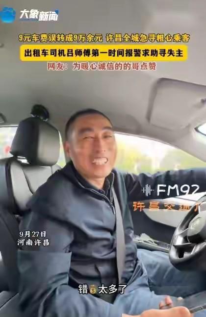 咱河南人就是中!许昌乘客坐出租,9元车费转9万!司机发现后心急如焚,报警寻找乘车