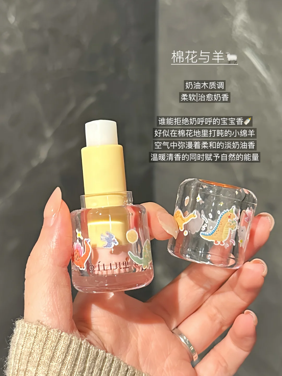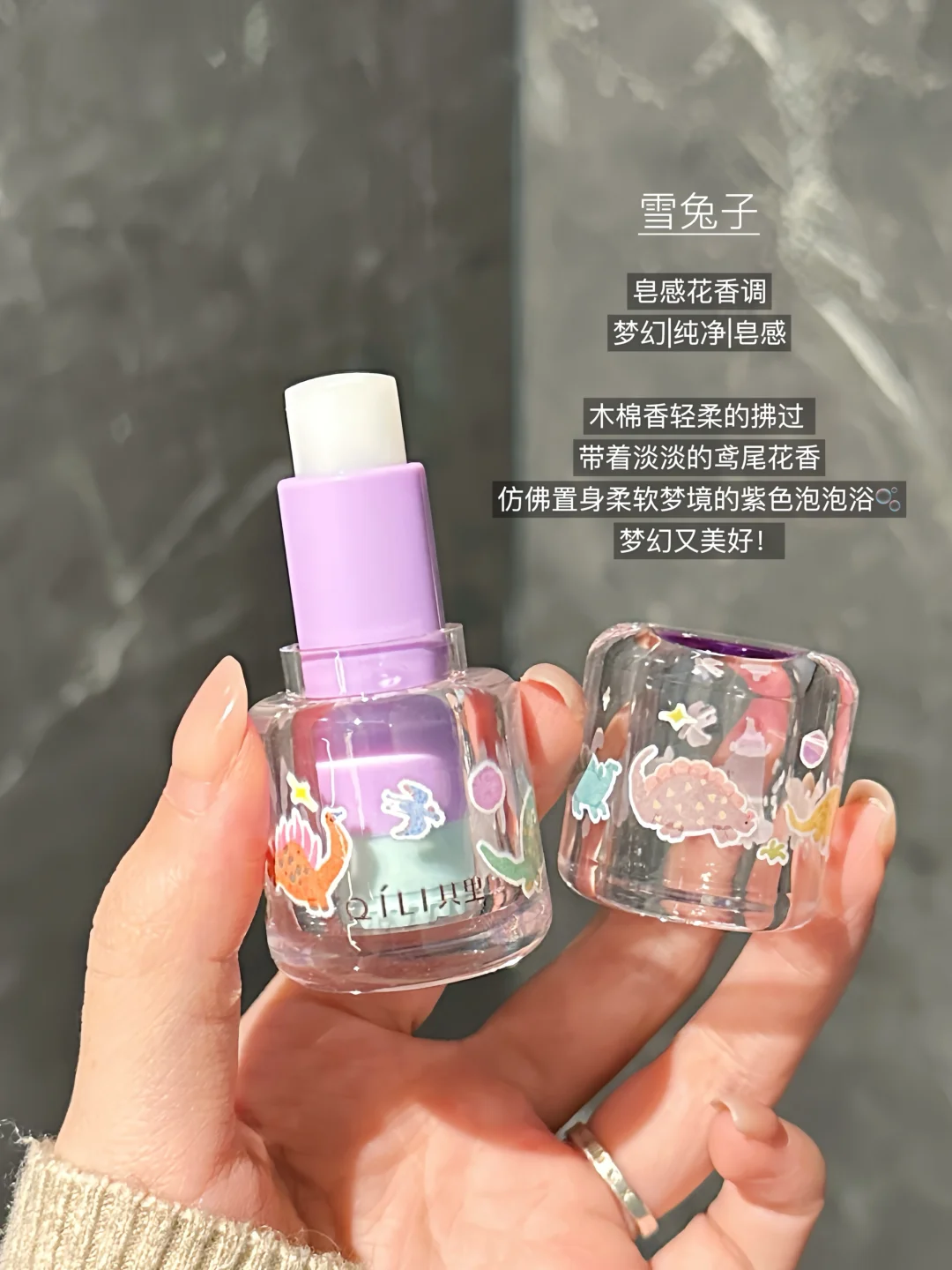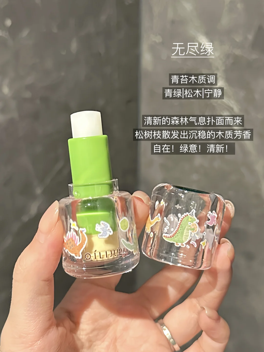膏 冲着包装买的…到手被香迷糊了!! 4个味道都好好闻啊😭 而且体温散香真!的!神! 轻轻点在耳后、手腕、脖子后面 随着体温升高香味就慢慢散发出来了 就像自己透出来的伪体香一样 口红大小~旋转出来就能涂 包装尊嘟好戳我😍 马卡龙撞色➕小恐龙印花🦕 每个味道都是对应不同颜色的小恐龙 尊嘟被狠狠可爱住了!! 膏体软软糯糯的 一抹就融开了 用起来清爽不黏糊! 天然植物精华,没有酒精敲温和 可以安心贴肤涂👌
