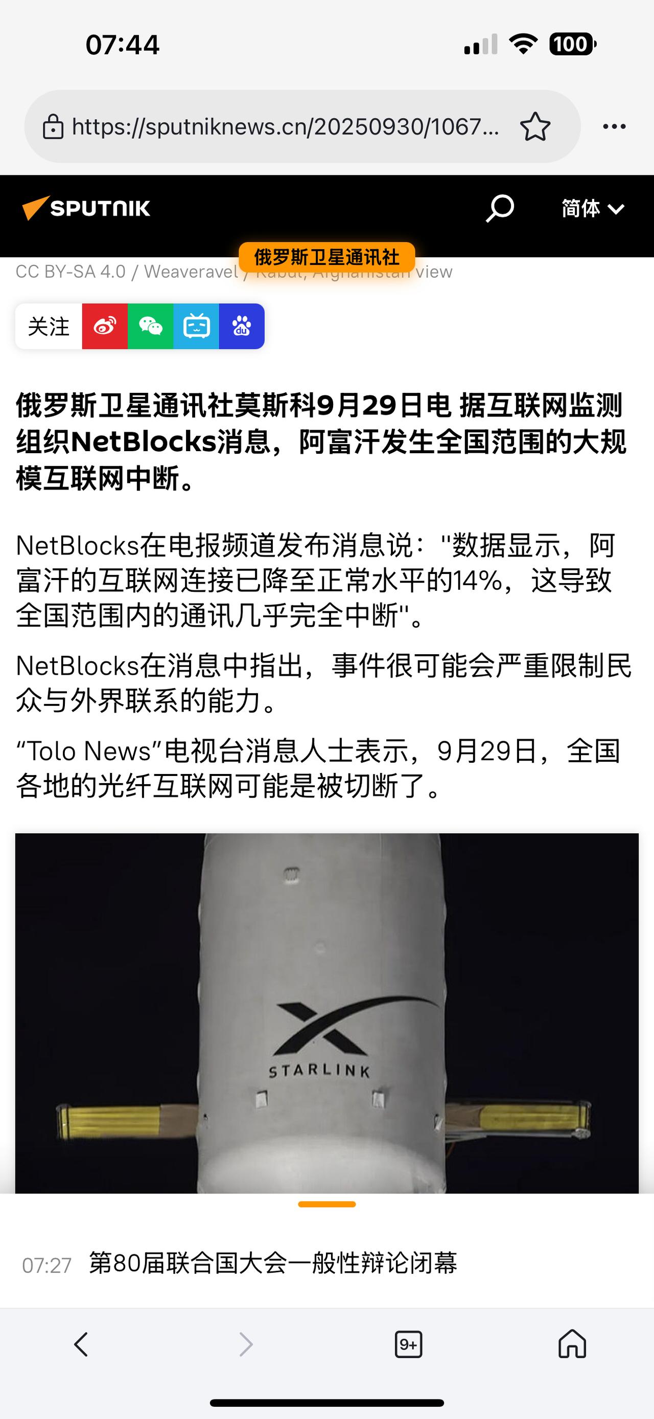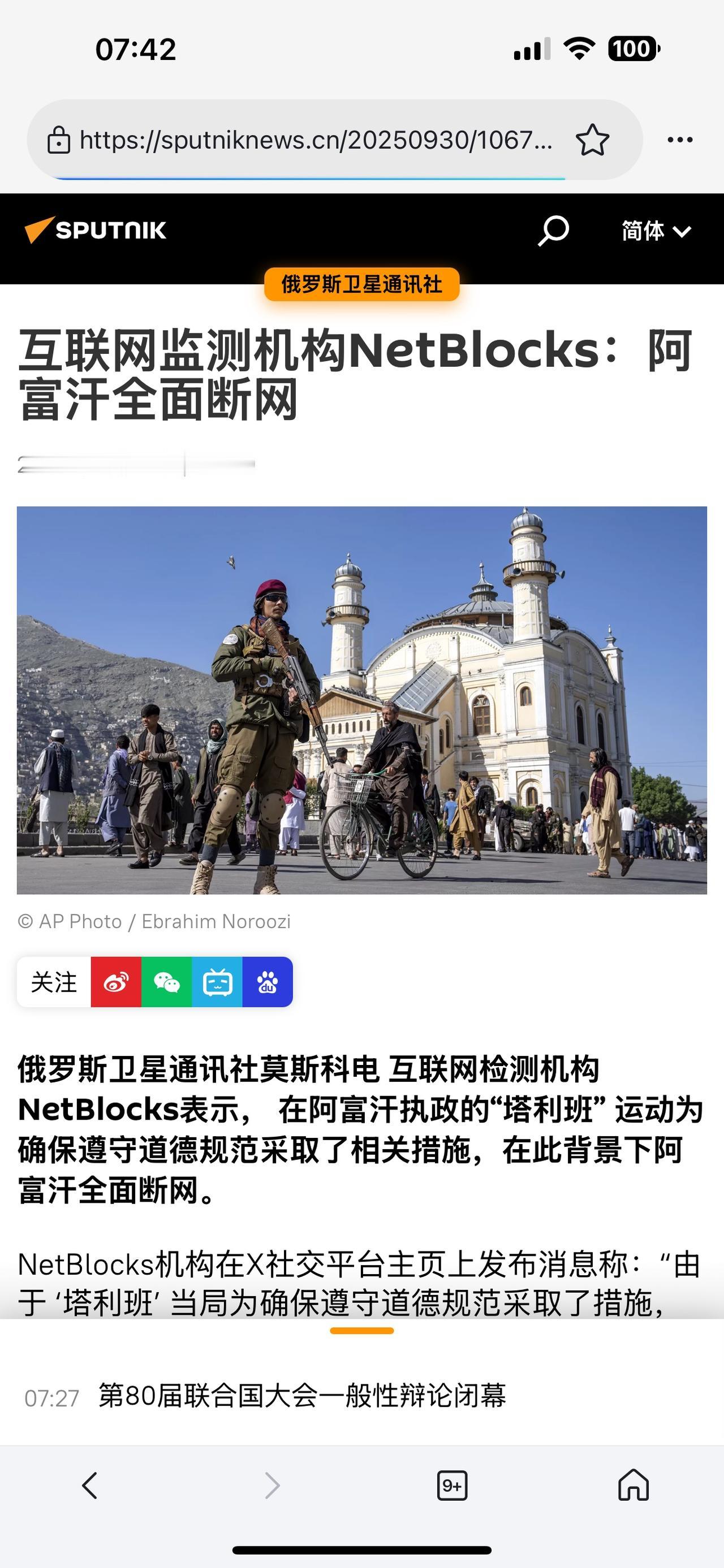 阿富汗塔利班:在剥夺女性学习和就业的权利后、又切断互联网 (欢迎关注点赞支持) 2025-9-29互联网检测机构NetBlocks表示, 在阿富汗执政的“塔利班” 运动为确保遵守道德规范采取了相关措施,在此背景下阿富汗全面断网。 阿富汗目前处于全面断网状态。当地时间9月29日早上逐步关闭了多个网络,目前电话服务也受到影响。 观察分析:由于塔利班上台后,剥夺了女性接受教育、就业的权利;并且规定不能在公共场合播放,除《古兰经》以外的音乐、电影等一系列反人性、反文明的措施,使阿富汗社会发展与现代文明背道而驰!因此,目前国际社会除了俄罗斯,基本上不承认塔利班政权的合法性, 现在,塔利班政府为了加强对国内的管控,确保老百姓遵守其道德规范,彻底关闭互联网。其目的是想建立一个与外界隔绝的“局域网”,以确保阿富汗老百姓无法获得外部信息。 目前,国际社会还未就阿富汗此举发表意见,如果未来阿富汗未能恢复互联网,将一定会招致严厉的批评,使其重返国际社会的努力化为泡影!