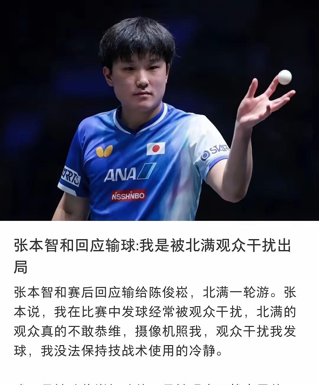 张本智和输了陈俊菘不服气,直言不是输给了陈俊菘,而是因为现场观众的干扰。这输球理由找的有点太牵强了,陈俊菘是第一次打大满贯。张本智和都是打过奥运会的人物,今年的大满贯都已经打了四次了,他还埋怨观众呢? 以后观众将会是乒乓球运动不可或缺的一部分。没有观众的乒乓球那是没有灵魂的。只有在中国的比赛那才是最有灵魂的,最有情绪价值和精华的赛场。 郭焱直播了张本智和和陈俊菘的比赛,期间她一直低估陈俊菘的打法特别的别扭。现在知道了陈俊菘不是颗粒打法,是左手生胶打法。这在男线里是极其少见的。这也印证了这次陈俊菘资格赛出现后为啥会直落张本智和那里。就是想打张本智和一个出其不意。所以,张本智和输在了陈俊菘的特殊打法上。输在了他没把排名133的陈俊菘看在眼里。输在了他赛前扬言要拿到中国大满贯的冠军争取来到世界第一。 陈俊菘说的没错,他确实是太狂了。这句话戳得张本智和心窝子疼,他不爽。极度的不爽,他要报仇。张本智和可能会去支线赛等着陈俊菘的。