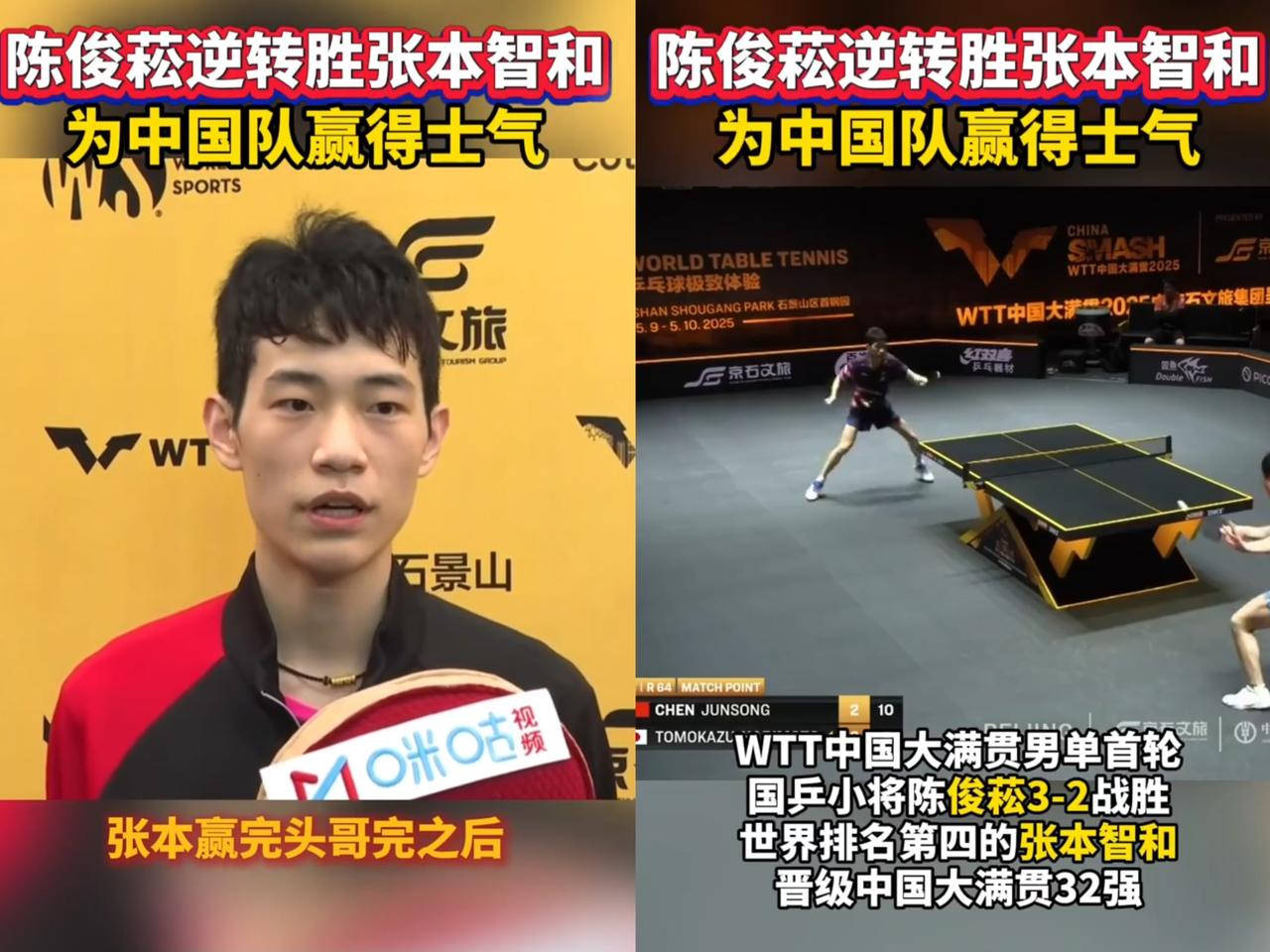 张本智和首轮就败, 原因真找到了? 说不是对手陈俊菘太强,也不是 忘叫暂停,竟扯到张本宇穿的衣服上!张本宇是张本智和他爸兼教练,以前还是咱四川队的,后来入了日本籍。张本智和赛前喊着要当世界第一 想和王楚钦决赛会师,结果连续两站首轮出局,成了笑话。比赛时张本宇眼睁睁看着儿子输球,攥紧拳头也没办法。 有人吐槽他穿的衣服远看像囚服,不吉利。但实际上,张本智和输球主要还是不适应对手左手生胶打法,关键分处理不好,心理抗压差。 咱就说,把输球原因怪到衣服上,这说法有点扯不过比赛嘛,各种因素都可能影响。大家觉得张本智和输球,还有啥原因?