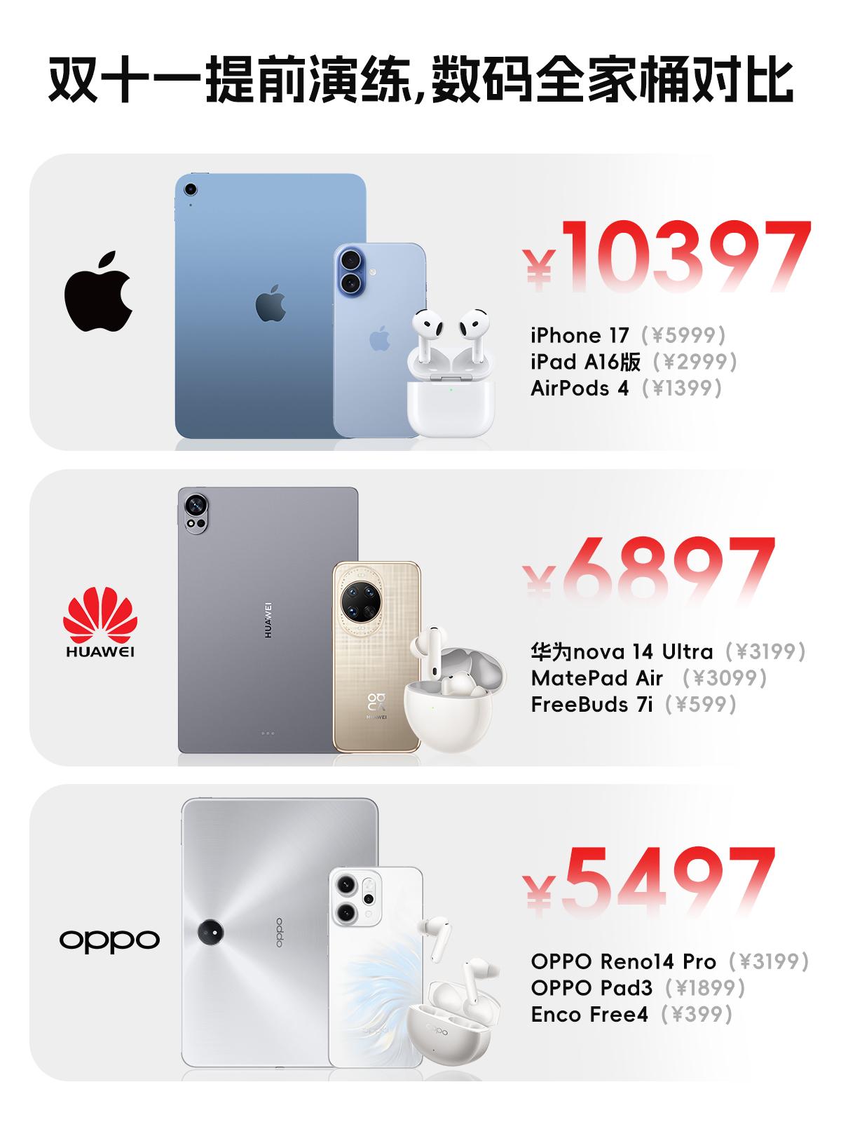 双十一提前演练🧾数码全家桶选购指南 国庆节一到,双十一还晚吗? 想要换新装备的姐妹们可以提前规划起来啦! 今年数码全家桶怎么选不踩雷 这篇保姆级攻略速速码住👇 🍎土豪闭眼入:苹果全家桶 iPhone 17(5999) + iPad A16版(2999) + AirPods 4(1399) 一套下来1W+,生态无敌流畅 (💰钱包君要撑住! 🌸长辈/花粉优选:华为全家桶 华为nova 14 Ultra(3199) + MatePad Air (3099)+ FreeBuds 7i(599)一套下来近7K,鸿蒙生态超便捷,续航信号都很顶,适合爱国产牌的家人~ 💜性价比+全能王:OPPO全家桶 OPPO Reno14 Pro(3199) + OPPO Pad3(1899) + Enco Free4(399) 一整套5K+就能配齐!ColorOS跨设备互联超丝滑,学生党&务实派可冲👍 👀看完这波数码全家桶盘点发现,OPPO家感觉性价比高,而且全家桶三件套也很能打! 手机Reno14 Pro颜值质感好,性能也不错,影像系统也是旗舰级别的,广角到长焦无缝切换拍摄,有超越iPhone的实况体验; 平板OPPO Pad 3又144hz大屏,还有流畅性能。 还有耳机Enco Free4,颜值很高的同时音质不错,加上超强人声降噪,以及苹果同款自适应模式,价格很香。关键是价格便宜,三件套下来6k不到..... 🎯 双十一攻略: 1️⃣ 10月底蹲直播间领🧧 2️⃣ 凑单满减+平台券叠buff 3️⃣ 以旧换新多品牌补贴 4️⃣ 保价服务一定要开通! ⚠️早加购早比价,祝大家都能用最优价格抱走心仪全家桶✨