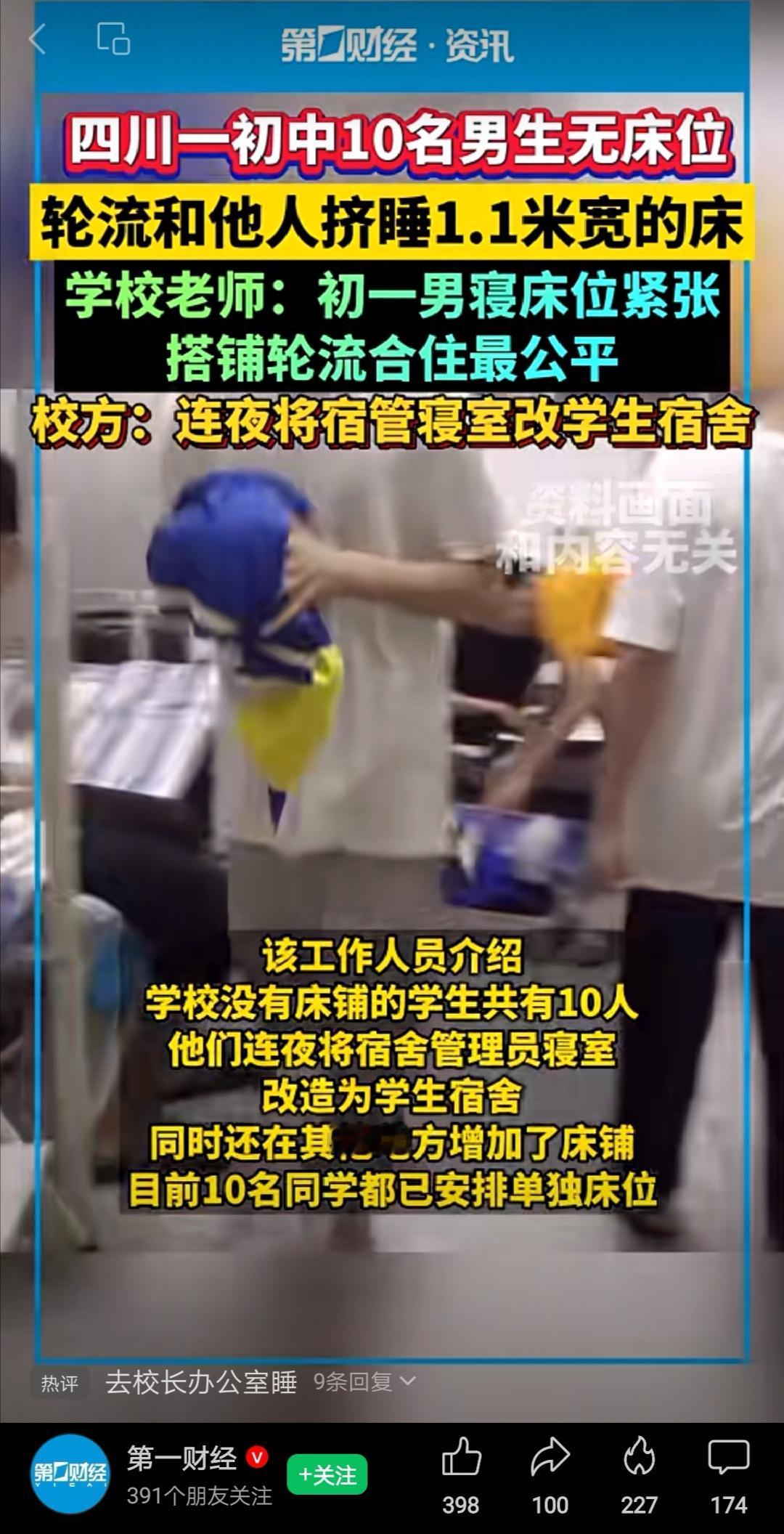 让学生寄宿,学校提供一个寄宿床位,这不是什么高要求吧?让两个同学挤一个床位,家长不曝光,媒体不报道,学校就不解决,这让人说什么好呢?