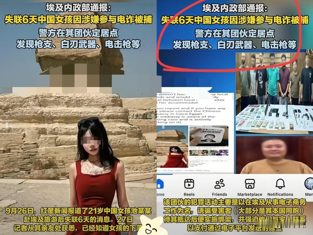 这回真是她妈尴尬了! 在埃及失踪的中国女孩被找到, 但同时被找到的还有被其 团伙持刀带枪的绑架团伙,而这姑娘,居然是团伙里的“自己人”! 之前她妈急得在网上发求助,话里话外全是担心,多少网友跟着揪心,怕孩子遭遇不测! 结果反转来得比电视剧还狠:她根本不是受害者,是帮着骗同胞的“帮凶”! 专挑中国人下套,用“电商高薪工作”当诱饵,把人骗到埃及就立马翻脸,绑架勒索赎金,手里有刀有枪,比电诈凶多了! 她闺蜜当初差点就信了,现在想想,怕是后背还冒冷汗! 最让人唏嘘的是她妈,之前有多焦急,现在就有多难堪,估计连觉都睡不着,满脑子都是后悔! 都说“出门在外防坏人”,可谁能想到,“失踪者”会变成加害者,连亲妈都被蒙在鼓里? 这事儿哪是“尴尬”俩字能说清的?分明是给所有想出国找活的人泼了盆冷水! 那些听起来“不费力又赚钱”的机会,十有八九是裹着糖衣的陷阱! 大家对此怎么看?