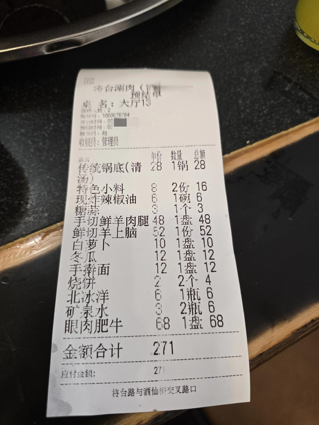 不提供水还乱记瞎账的饭馆北京城还有谁? 将台涮肉(酒仙桥店)位于北京朝阳区酒仙桥