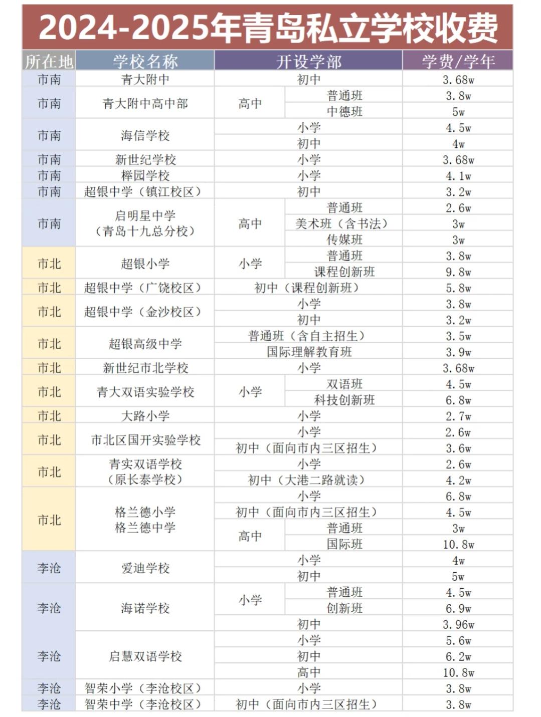 2024-2025年青岛私立学校收费一览:择校时的成本与价值考量 青岛的私立学校选择不少,学费从每年2.6万到10.8万不等,每所学校都有自己的特色。今天咱们就来聊聊这些私立学校的收费和特点,给家长们的择校提供些实际参考。 市南区的青大附中,初中部学费3.68万/年,高中部普通班3.8万/年,中德班5万/年。青大附中的教学质量在青岛私立初中里口碑不错,高中部的中德班则为有留学德国规划的家庭提供了便利。海信学校小学部4.5万/年,初中部4万/年,作为新兴的私立学校,硬件设施和课程设置都很有特色,注重学生的综合素质培养。新世纪学校小学部3.68万/年,榉园学校小学部4.1万/年,超银中学(镇江校区)初中部3.2万/年,这些学校在市南区的私立教育里都占据着重要位置,教学风格各有不同,有的注重应试,有的侧重素质教育。 市北区的超银系列学校学费差异较大,超银小学普通班3.8万/年,课程创新班9.8万/年;超银中学(广饶校区)初中课程创新班5.8万/年,(金沙校区)小学3.8万/年、初中3.2万/年;超银高级中学普通班3.5万/年,国际理解教育班3.9万/年。超银学校以严格的管理和优异的升学成绩著称,课程创新班和国际班则为学生提供了多样化的发展路径。新世纪市北学校小学部3.68万/年,青大双语实验学校小学部双语班4.5万/年、科技创新班6.8万/年,大路小学2.7万/年,市北区国开实验学校小学2.6万/年、初中3.6万/年,青实双语学校小学2.6万/年、初中4.2万/年,格兰德小学6.8万/年、初中4.5万/年,高中普通班3万/年、国际班10.8万/年。这些学校在市北区的分布较广,学费跨度也大,家长可以根据孩子的情况和家庭经济条件来选择。 李沧区的爱迪学校小学部4万/年、初中部5万/年;海诺学校小学普通班4.5万/年、创新班6.9万/年,初中部3.96万/年;启慧双语学校小学5.6万/年、初中6.2万/年、高中10.8万/年;智荣小学(李沧校区)3.8万/年,智荣中学(李沧校区)初中3.8万/年。李沧区的私立学校在课程特色上也很有亮点,比如爱迪学校的国际化课程、海诺学校的创新班、启慧双语学校的双语教育等,为李沧区的家长提供了不少选择。 选择青岛的私立学校,不能只看学费高低,更要关注学校的办学理念、师资力量、升学情况以及校园文化是否适合自己的孩子。比如,孩子适合严格的管理还是宽松的环境,学校的升学成绩如何,有没有适合孩子兴趣的社团或课程等,这些都是需要综合考虑的因素。 你对青岛的私立学校有哪些了解?你觉得在选择私立学校时,学费和学校的综合实力该如何权衡呢?青岛公立幼儿园 青岛小升初规划 青岛学区 青岛公立学校 青岛公立高中 青岛民办中学 青岛格兰德学校
