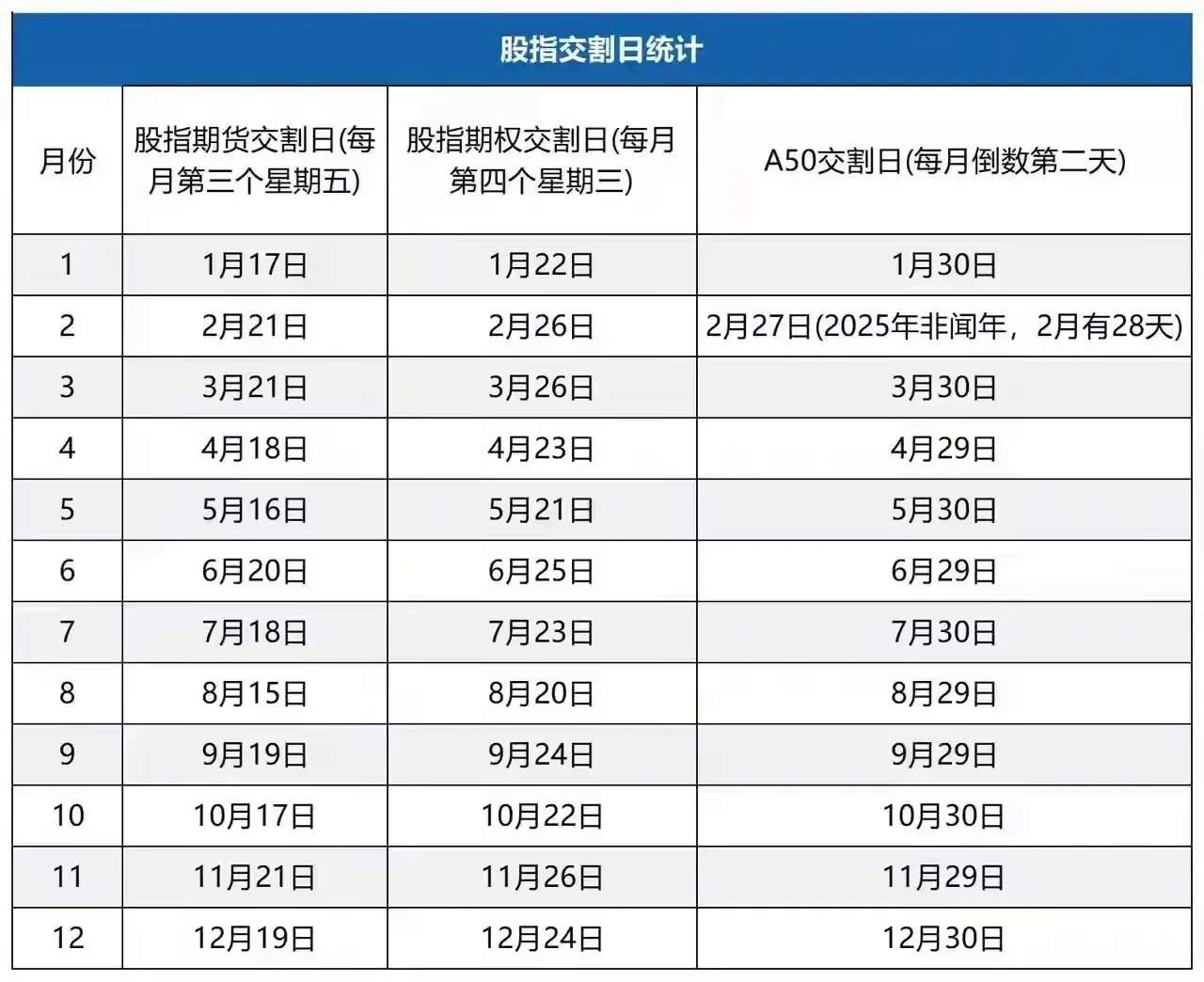这是2025年的股指交割统计表,每个月都有3次股指交割。只要到了股指交割日,股市