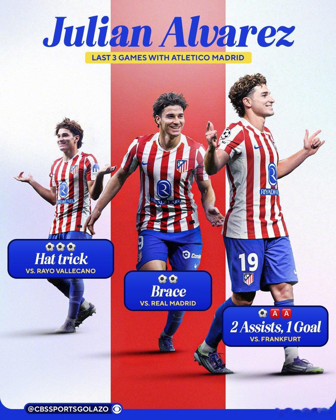 【状态爆炸】欧冠 联赛阶段,马竞5比1法兰克福,阿尔瓦雷斯贡献1球2助攻,近3场比赛他制造了8球,包括6粒进球和2次助攻。