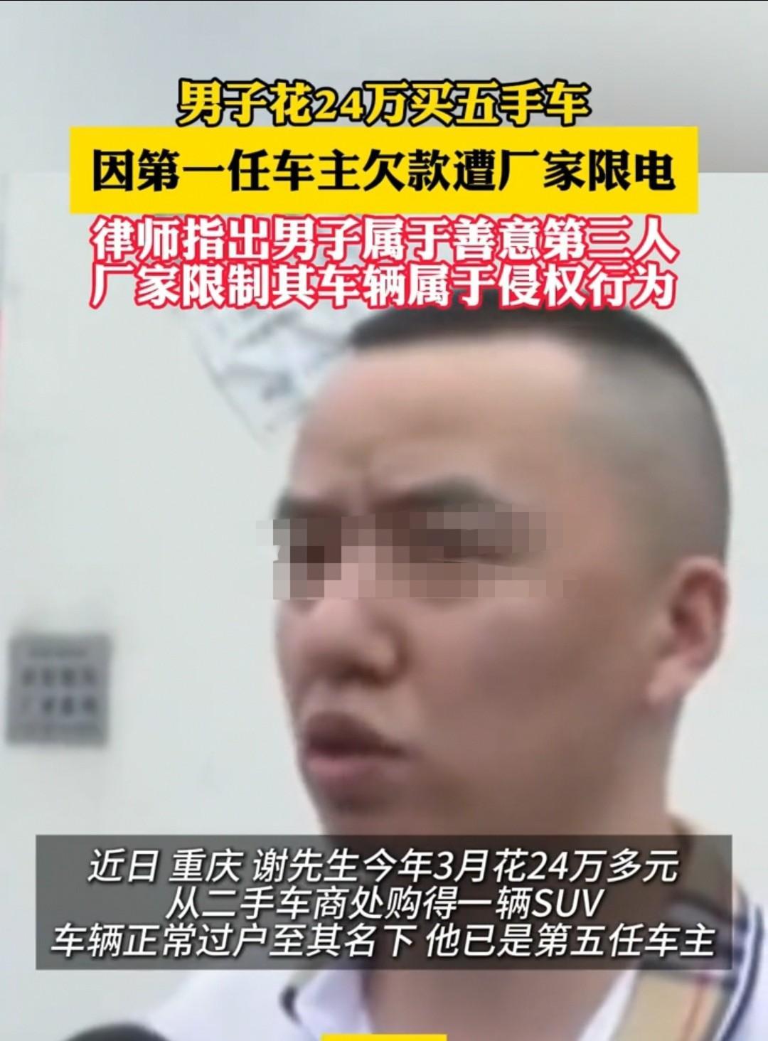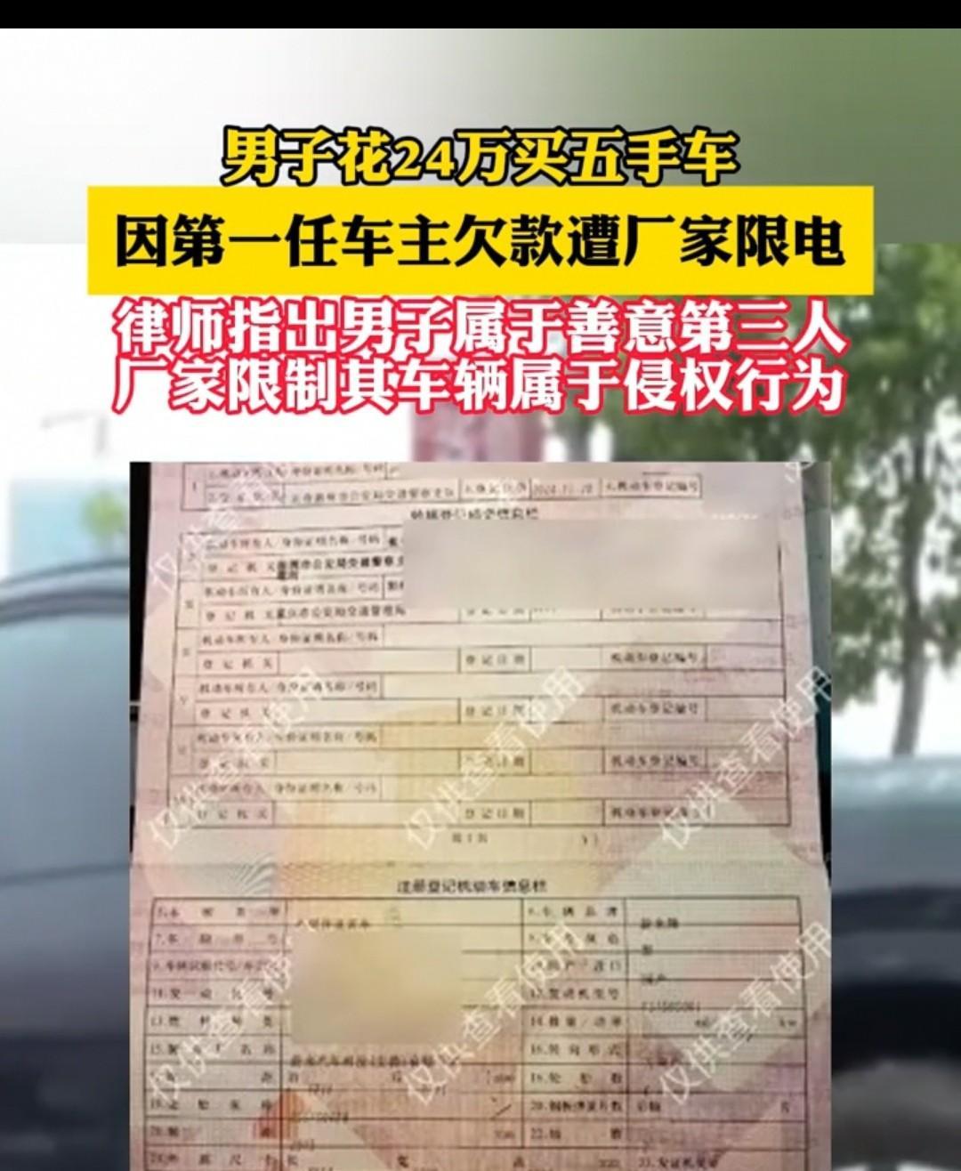 第一任车主不还贷,第五任车主被远程限电,你说冤不冤?重庆,有个男的车子突然抛锚,联系厂家,对方说就是我们给你断的电,你没交车贷。男的郁闷了,我是第五任车主啊,哪来的车贷?我可是花24万全款买的车。对方说那是第一任车主没还。男的急了,那关我啥事?你该去找第一任车主啊。对方却说没办法,规定就是这样,不还车贷就只能限电。男的怎么据理力争都没用,最后也泄气了,说自己花24万完全买了个寂寞,这不是闹着玩嘛。 素材来源于:零度时评 之前谢先生去逛二手车市场,一眼看上辆蔚来SUV,越看越喜欢,越试越想买,最后花24万拿下了。 要说这24万都能买辆新车了,可他就是跟这车有缘分,看见就挪不开眼,非得买下来才舒服。 买回来后,谢先生天天开,用了半年车子都好好的,他觉得这钱花得值。 后来有朋友喊着去自驾游,谢先生特别高兴,开着车就一起去了。 从重庆到广州路程远,谢先生每次都把电充满,就怕拖大家后腿。 可就算这样,事发当天车子开着开着就没电了,车上所有按键怎么按都不管用,用钥匙启动也不行。 谢先生心里别提多失落了,咋回事啊?之前之后都没事,偏偏自驾游的时候掉链子,多少给点面子啊。 可车子跟钉在那儿似的,稳如泰山,说啥也不动。 谢先生没辙,赶紧给厂家打电话,对方倒实在,说你车子没毛病,是我们远程给你限电了。 谢先生又惊又懵,好端端的,你给我限电干啥?我还在自驾游呢,赶紧给我恢复啊! 对方不客气地说,这车的车贷没还,你凭啥让我们恢复供电? 谢先生这才反应过来,这不是我的问题啊!我花24万全款买的,你说的是谁没还车贷?是不是第一任车主? 客服说确实是第一任车主没还,所以这车暂时不能用,得等对方还了车贷才行。 谢先生觉得对方不讲理,第一任车主欠你钱,你找第一任车主去啊,找我干嘛?我都是第五任了,中间隔了好几个人,你咋就不明白呢? 而且我是正规过户,车子早就在我名下了,你们之间的矛盾不能扯到我身上吧? 可对方直接回了句,车子是你的没错,但车机系统是我们的,我们就是能给你限电。 谢先生这下真是叫天天不应叫地地不灵,彻底没辙了,这事儿确实棘手。 他赶紧找去蔚来体验中心,把问题说了,让工作人员帮忙协调,可对方也两手一摊,说没办法,是系统限的电,我们体验中心能有啥办法?你还得直接找厂家。 最后记者帮忙联系上客服,问到底啥情况,按道理说,要是车子办了抵押贷款,根本不能过户啊。 关键是谢先生花24万正常过户,车子都成他的了,凭啥不能正常开、不能用你们的充电服务? 客服查了之后说,第一任车主办的不是抵押贷款,是信用贷,所以车子能正常过户。 记者又跟对方据理力争,你们跟第一任车主有纠纷,就该找当事人,别连累现任车主啊。 要是都这样,谁还敢买你们品牌的二手车?动不动就远程限电。 对方说会马上把情况上报,看看之后能不能恢复供电。 不过记者一直没收到后续消息,谢先生的问题到现在也没解决好。 简单说,厂家压根没资格给谢先生限电,要钱啊就只能找第一任车主,这事儿在法律上其实是说得明明白白的。 首先,谢先生花24万全款买的车,还正儿八经办了过户,这车的所有权早就彻底是他的了。 按《民法典》第240条规定,所有权人对自己的动产——就像就像这车子——享有占有、使用的完整权利,车机系统是车子的一部分,肯定得跟着车子归谢先生用啊。 厂家说“系统是我们的”就断电,本质上就是侵犯谢先生的物权嘛。 再者,第一任车主办的是信用贷,没给车子办抵押登记。 《民法典》第403条也明确说了,动产抵押没登记的,不能对抗善意第三人。 谢先生买二手车的时候又不知情,还是通过正规渠道买的,妥妥的“善意第三人”,厂家根本不能拿前任的欠债找他麻烦的。 厂家和第一任车主的贷款,那是他俩之间的事儿,按“合同相对性”原则,谁欠钱就找谁要去,该协商协商,该起诉起诉,没道理把风险转嫁给无辜的谢先生。 所以谢先生完全能硬气点:依据《民法典》第238条,要求厂家立刻解除限电,还得赔他因为车子用不了造成的损失。 要是厂家不配合,直接找消协投诉,或者去法院起诉就行,没什么好犹豫的。 对于此事,大家如何看?