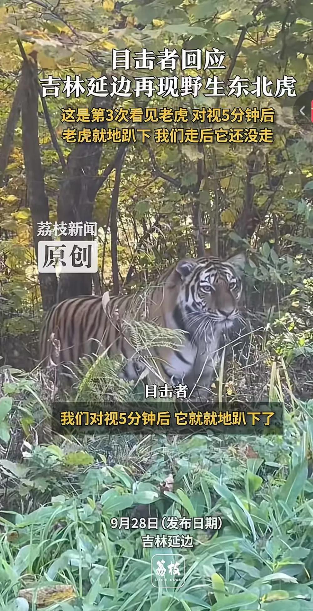 吉林延边,一男子正停车休息时,突然看到一只东北虎,不料男子一点也不害怕,这是他第3次看见老虎,直接跟老虎对视5分钟后,老虎就趴在地上了。网友:真虎,天不怕地不怕啊! 信息来源:荔枝新闻 这事儿发生在2025年9月下旬,具体哪一天咱还不清楚,反正就在吉林延边的一条林区公路边上。 这位大哥是林业系统的,听说之前就碰到过老虎,也算是有经验的人了。 当时他正停车歇着呢,估计是开累了想眯瞪一会儿,结果就听见树林里有动静。 大哥也是胆大,直接把车窗降下来瞅,这一瞅可不要紧,一只野生东北虎“嗖”地一下从杂草里钻出来了,离他的车还不到3米远!你说吓人不吓人? 这老虎瞅着也就两三岁的样子,虽然已经能自己过日子了,但看起来还是个“半大孩子”,行为挺小心的,没张牙舞爪要扑人的意思。 大哥和老虎就这么四目相对,足足看了有5分钟。 换作是咱普通人,别说对视了,估计老虎刚露头就得吓得魂飞魄散,一脚油门踩到底跑了! 可这位大哥呢?愣是没动,也没启动车子,更没敢瞎比划赶老虎,就那么静静地待着,继续观察。 后来老虎可能是瞅着这大哥没啥威胁,自己也累了,就找了个地方趴下歇着了,看样子是想省点劲儿。 按理说这时候大哥该趁机溜了吧?结果人家还是没挪窝,又在那儿待了好一会儿才走的。 后来专家说了,东北虎一般不把人当成猎物,你只要老实待着不动,让它觉得你没威胁,它自己评估完风险,就懒得搭理你了,趴下歇着就是为了少耗点能量。 这么一说,好像老虎也没那么可怕了?不过这胆子可不是谁都有的! 这事儿一出来,网友们可炸开锅了,评论区里全是“真虎!”“天不怕地不怕啊!”“这胆子也太大了,换我早一脚油门跑了!”“大哥心是真大!”之类的话。 确实,能跟野生东北虎这么近距离“对峙”还不跑的,咱也是头一回见。 不过话说回来,这大哥也是在林业系统工作,可能比咱更了解老虎的习性,知道这时候乱动反而危险。 不过现在这事儿还有些地方没弄明白,比如这位大哥到底在那儿待了多久才走的? 他当时心里咋想的?有没有媒体好好采访采访他,让他给咱唠唠当时的情况? 还有网友们那些评论,也没个完整的截图啥的。 也不知道后来林业部门有没有找他聊聊,提醒他下次注意安全啥的。 这些咱都还不知道呢。 不管咋说,这事儿也给大家提了个醒,在野外要是真碰到大老虎,可别学大哥这么“淡定”,毕竟咱没那经验。 专家不是说了嘛,保持静止,别让老虎觉得你有威胁,这可能才是最关键的。 反正尽量不要与老虎对视或做出挑衅动作,避免激怒动物。 若在车内遇到老虎,切勿立即下车,应保持安全距离后缓慢离开。 若老虎发起攻击,可挥舞衣物、工具(如木棍)或发出大声嚎叫,分散其注意力并创造逃生机会。