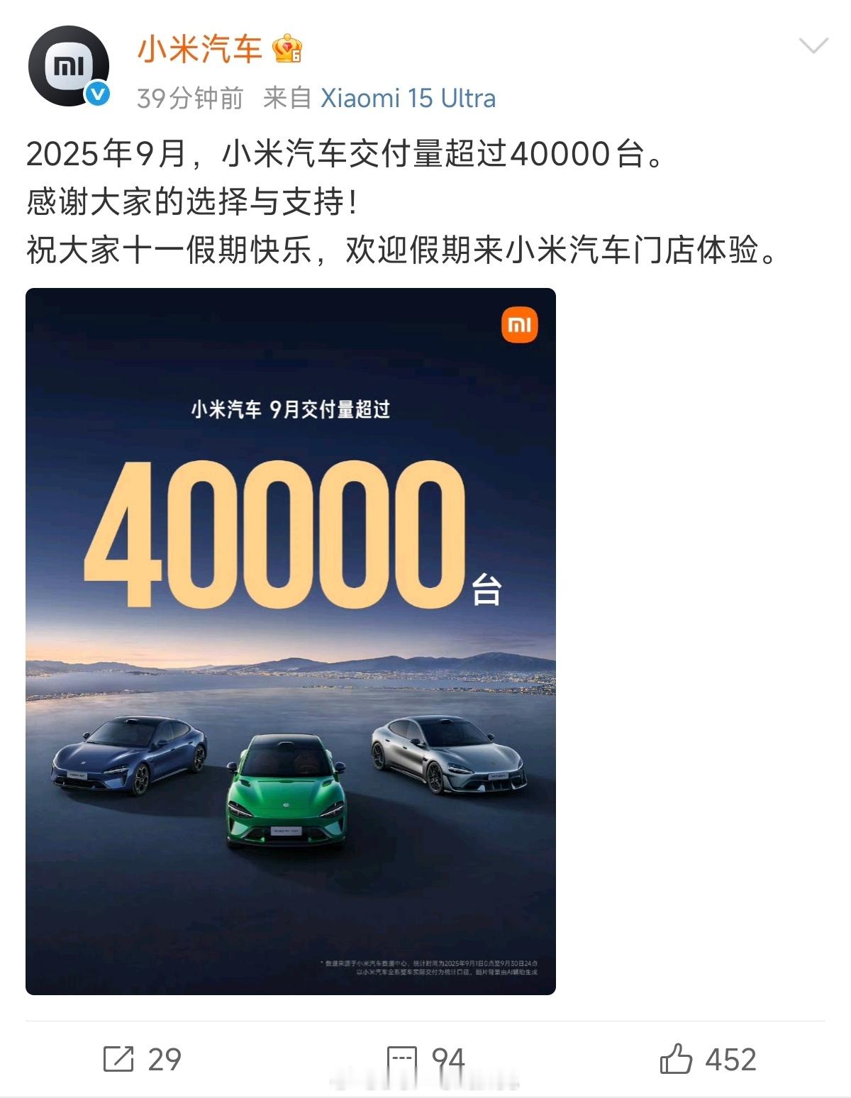 小米汽车9月交付超过4万台!!!