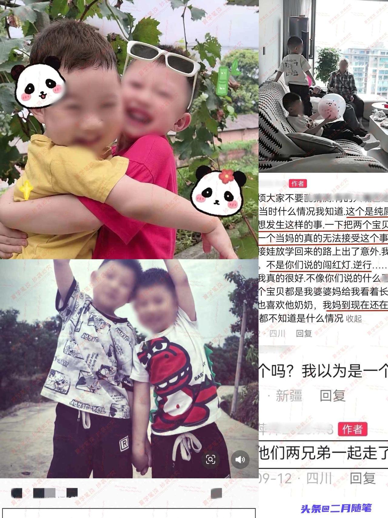 四川一家两男童去世, 哥哥7岁弟弟5岁, 开学才几天,妈妈自责不已! 7岁和5岁双胞胎放学路上被撞身亡! 妈妈自责痛哭, 谁该为这场悲剧负责—— 开学才一周, 四川眉山一对7岁和5岁的双胞胎男孩, 在放学路上遭遇车祸当场离世, 接送的外婆也重伤昏迷! 悲剧发生前, 妈妈还在朋友圈晒出兄弟俩穿着新校服、 背着书包的灿烂笑容, 谁能想到这竟是最后的合影...... 表面看是意外, 实则暴露诸多安全隐患: 老人骑电动车接送成了无奈的选择, 反应迟钝、 体力还弱; 县城道路设计不完全合理, 红绿灯、 护栏缺失; 校车覆盖不足, 还有年轻父母忙于工作...... 悲剧发生后, 多地才匆匆出台"禁止70岁以上老人骑车接送"等补救措施, 但为何非要等到惨剧发生之后才开始行动? 安全不是口号, 别等孩子付出生命代价了才引起重视! 2岁男童事故