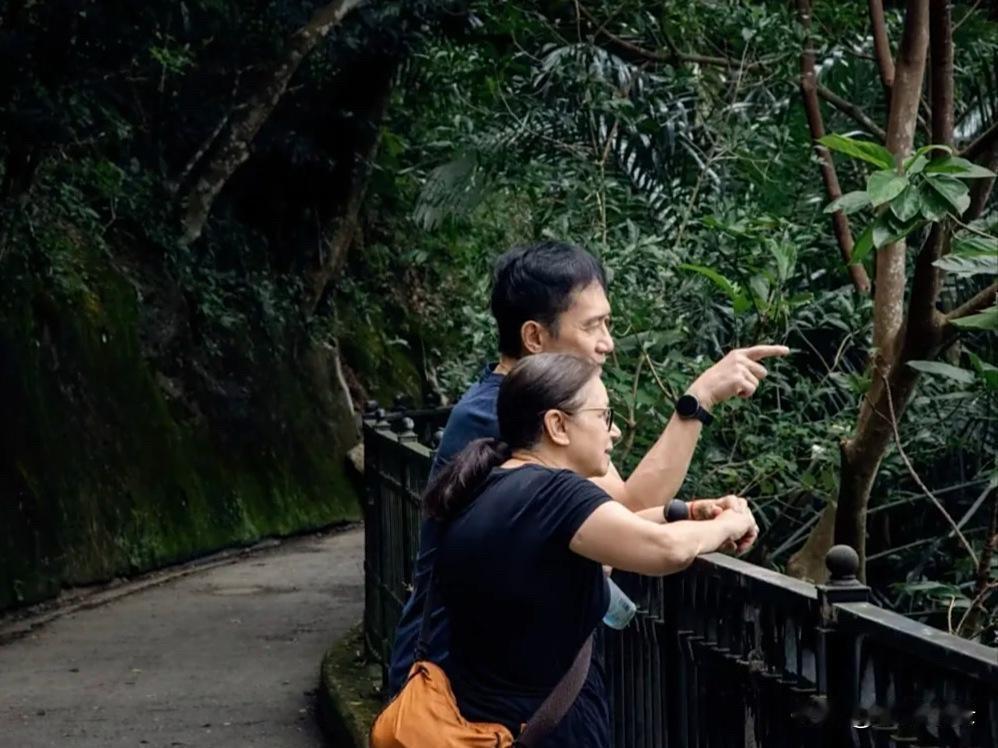 63岁梁朝伟在香港太平山顶被偶遇,他和最近合作的一位外国女导演在欣赏风景,穿着短