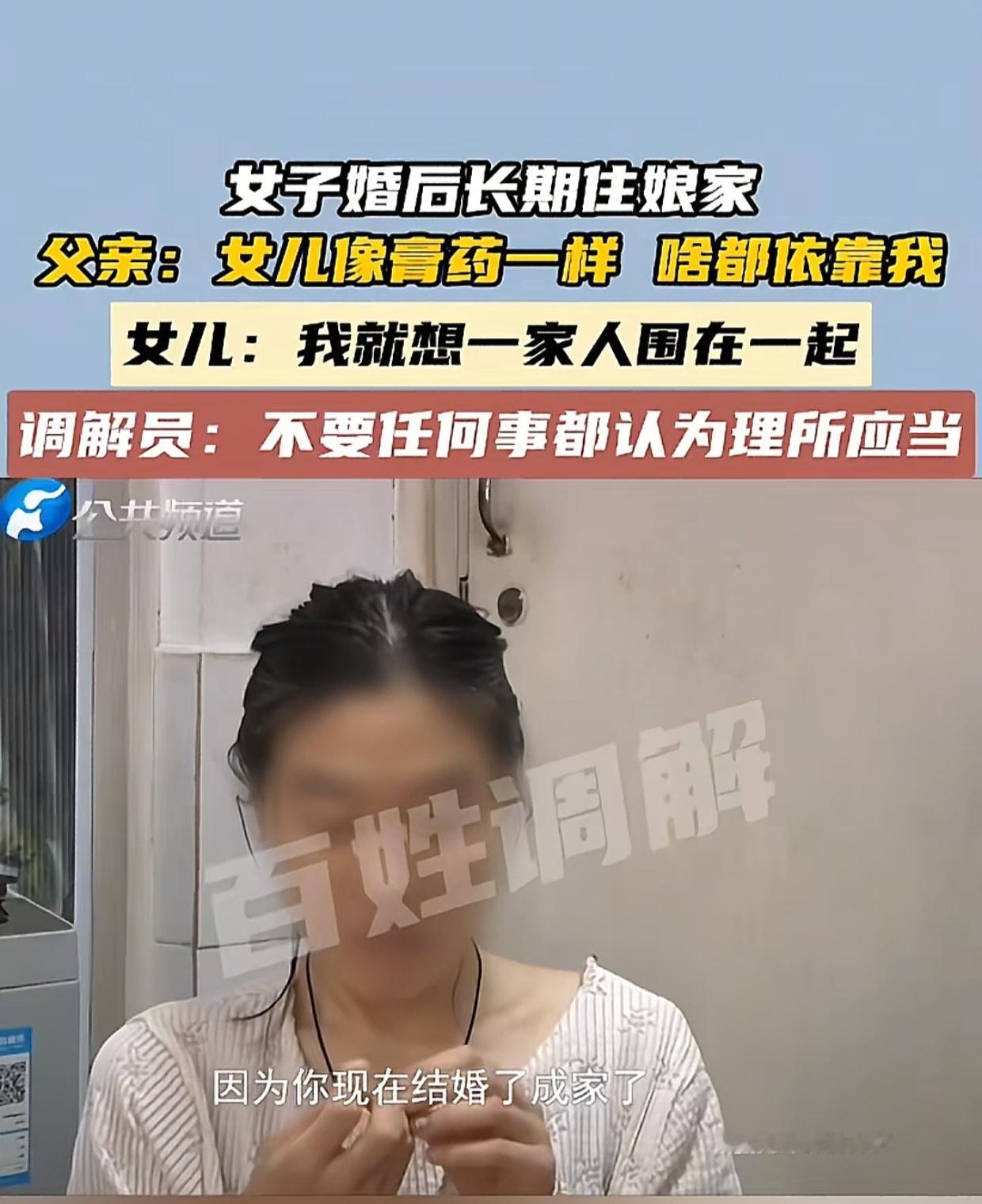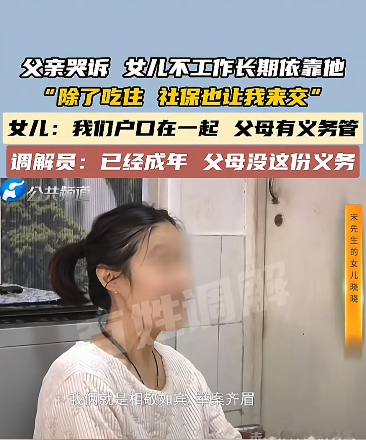 河南女子30多岁,带着孩子住在娘家,每月要花娘家2000多元。父亲不堪重负请了调解员,没想到女子表示:“我们在一个户口本上,你们有责任养我!” 女子本科毕业,已婚,丈夫长期在外地工作,半个月才回来一次。女子有小孩后和公婆发生矛盾被打了一顿,从此回了娘家,在娘家一住就是两三年。 父亲要承担女子和孩子的生活费,还要给女子交养老保险,每月要花2000多元,再加上女子的母亲也卧病在床,需要寻医问药,父亲不堪重负。 父亲多次催促女子出去工作,或者回婆家生活,可女子坚决不同意,还几次三番和父亲争吵。 父亲忍无可忍,一气之下求助了调解员,烦恼地说,她现在像膏药一样贴在我身上,啥都依靠我! 父亲告诉调解员,女儿和其丈夫实行AA制,所以有什么花销都找娘家要钱,包括每月1100多元的养老保险。 调解员不解地问女子,你现在结婚成家了,还要养孩子,为什么不问自己丈夫要钱? 女子表示她和丈夫相敬如宾,举案齐眉,如果问丈夫要钱他会给的,但她不想问丈夫要,不想给他添负担。 父亲对女儿的说法表示不解,说不问丈夫要钱也可以,但要出去工作,保持经济独立。 没想到女子理直气壮地表示,我们在一个户口本上,你们有责任养我! 调解员都无语了,明确表态说,你已经成年了,父母没这份义务,做人不能太自私! 看完视频,感觉女子作为一个受过高等教育的人,思想和认知让人匪夷所思。 表面上看就是一个从小被溺爱的孩子长大了,不懂做人的责任感,是一个对父母只知索取的寄生虫。 但从其不安的肢体动作和一些不符合正常思维的言论来看,也许是婚姻和心理都出现了问题。父母多了解一下她的婚姻状况,深入沟通一下,或许能找到原因。