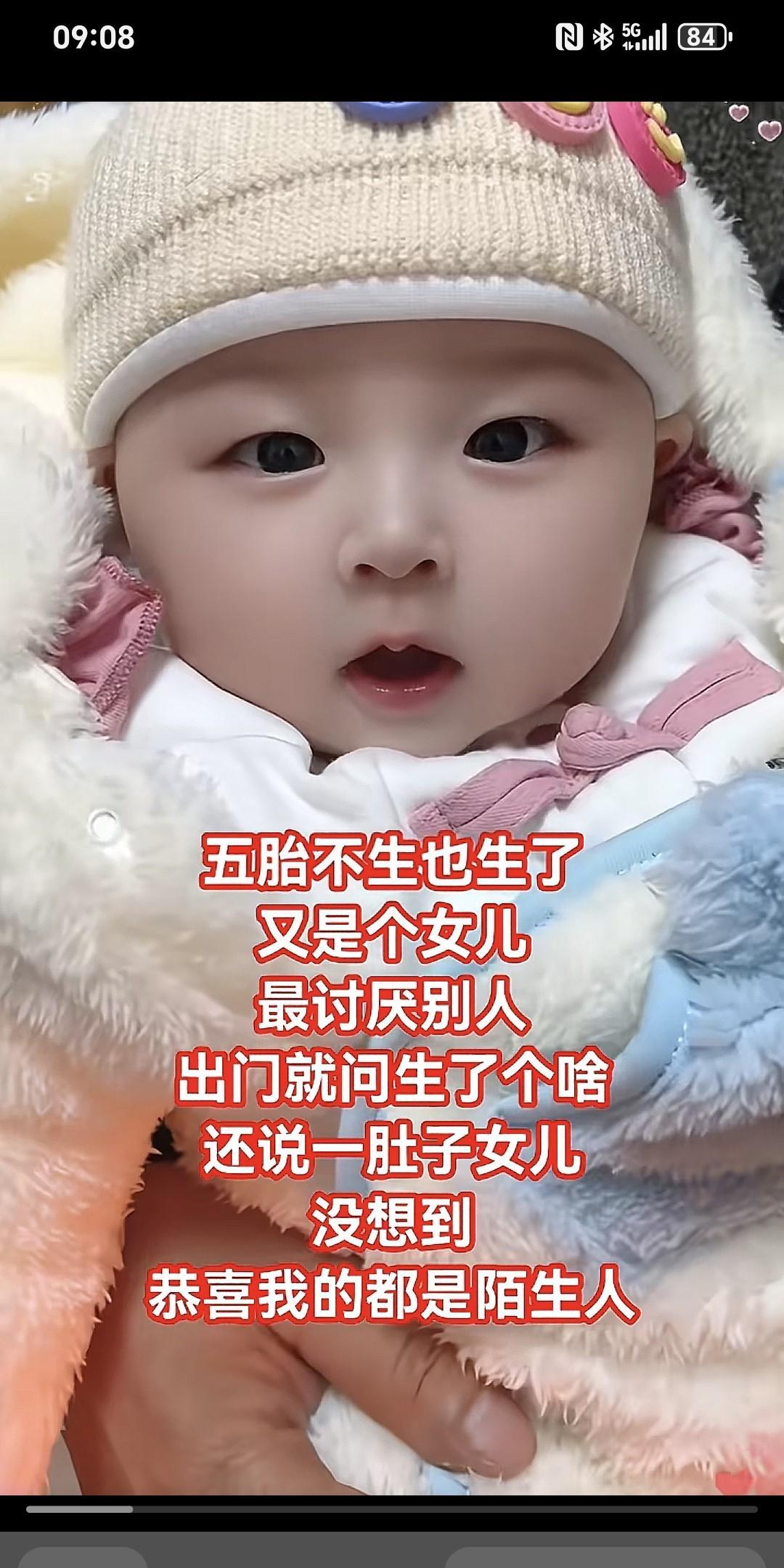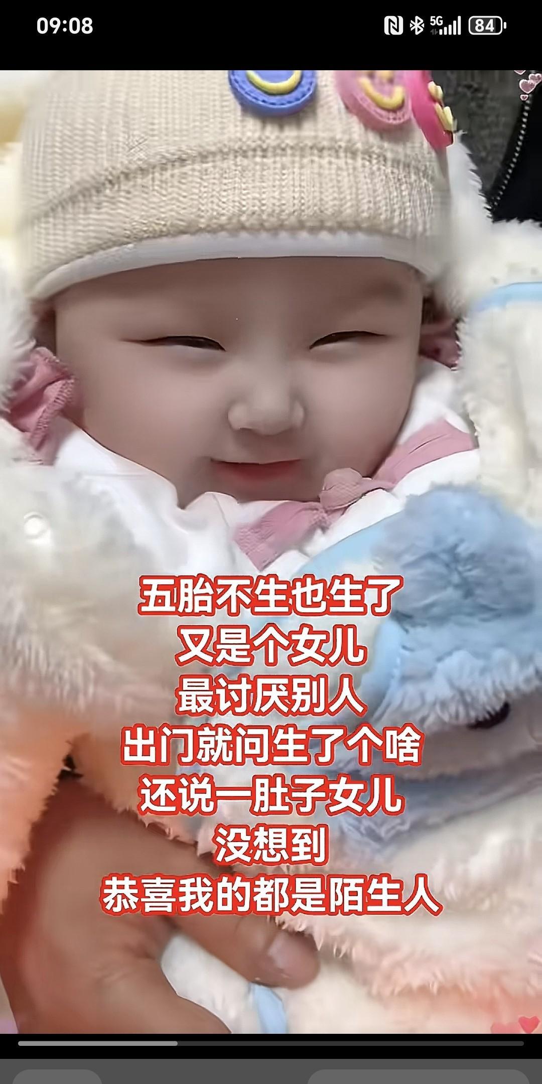 五胎不生也生了,又是女,最讨厌别人出门就问生了个啥,还说一肚子女儿,恭喜我的都是陌生人。 好漂亮的萌宝,开心自豪才对啊!别人算老几啊!宝贝平安健康的成长就足够,自己生自己养,别人把他当空气就好。 全是女儿,那是你的福气,别人冻的瑟瑟发抖,你会热的全身冒汗,这么可爱的小天使,你就幸福吧! 美女女儿好,五个女儿是你的财富,等老了你才有福呢,要是五个儿子你试试到老了饭都吃不上一口,你就偷着乐吧[祈祷][祈祷][祈祷]#五个女儿妈妈的焦虑#