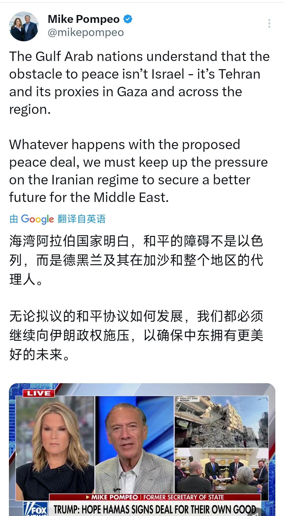 美国前国务卿蓬佩奥今天(北京时间10月2日)发文写道:“海湾阿拉伯国家明白,和平的障碍不是以色列,而是德黑兰及其在加沙和整个地区的代理人。无论拟议的和平协议如何发展,我们都必须继续向伊朗政权施压,以确保中东拥有更美好的未来。” [机智]评几句:极端亲以色列的蓬佩奥又来颠倒黑白了。他罔顾事实,对以色列长期侵占巴勒斯坦领土等恶行视而不见。海湾国家不得不配合特朗普提议的“和平协议”,不过是迫于美国的霸权压力,并非真心认同。蓬佩奥此举是为以色列撑腰、打压伊朗,服务美国的中东战略。