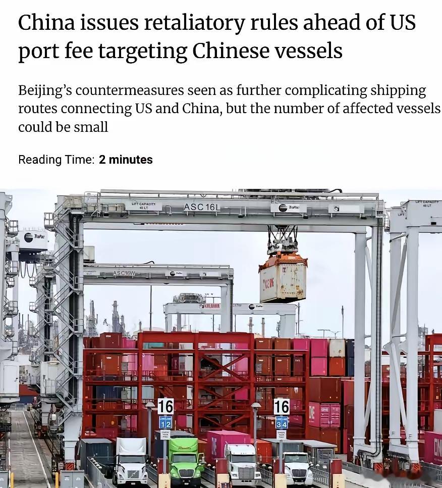 外媒:美国将在两周后对中国建造或运营的船只征收额外港口费用。对此,中国修订国际海运条例,允许采取对等措施,包括对相关船只收取特别费用、限制或禁止进入中国港口,以及禁止相关组织和个人获取中国航运数据或参与中相关业务。