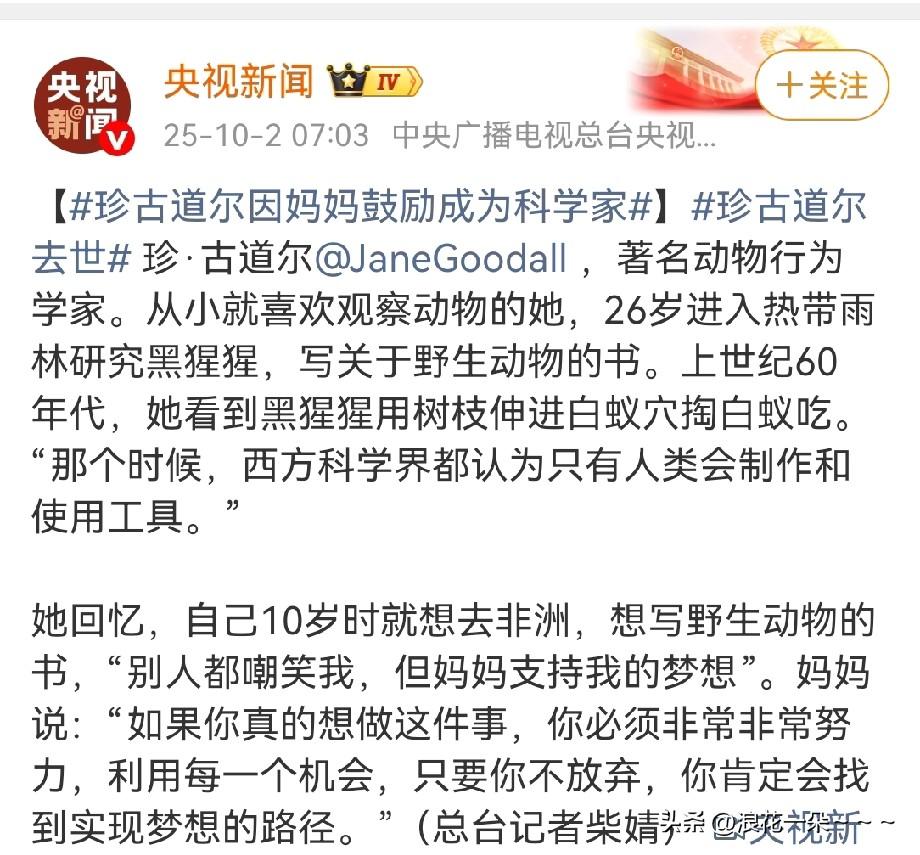 一个不起眼的新闻! 91岁的珍古道尔不幸去世!大家英语课本里都见过她吧。她一辈子