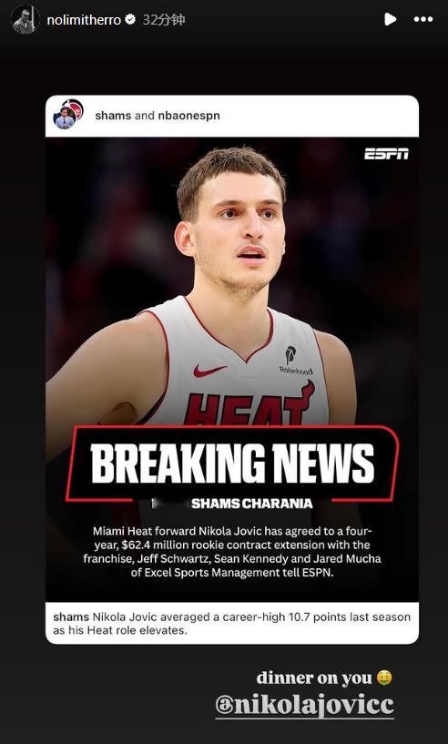 约维奇续约成功!希罗ins喊话:这顿饭你买单[钱][钱]​​​