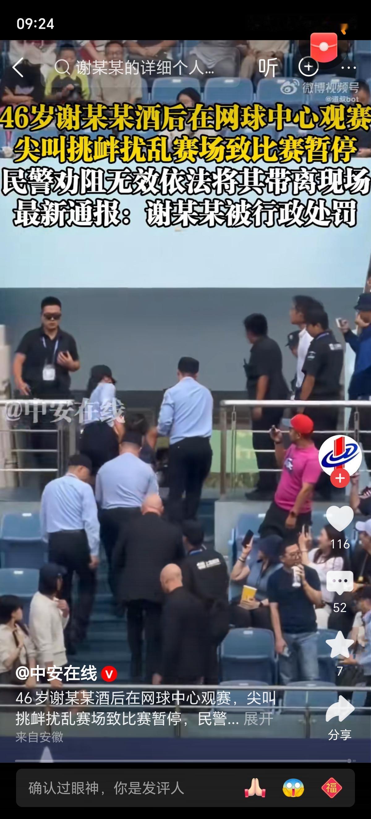 看比赛看到尖叫不停被拖出赛场也是牛人了,拖她出赛场还得用3个人,能看出来力气不小。就这样还能闹的比赛暂停足以自傲很久了吧? 好奇人喝醉了真的可以这么疯吗,都跑到网球中心耍酒疯了,我喝过一纸杯啤酒🍺就感觉自己醉了,然后就不喝了,自己坐那里呆1到2个小时才缓过来酒劲,感觉自己意识还是清醒的啊,这姐们咋疯成这样呢? 事情的详细经过是这样的: 2025年10月1日下午,ATP1000上海网球大师赛旗忠网球中心赛场突发意外状况:46岁的谢某某因酒后持续尖叫、挑衅安保人员,严重扰乱赛场秩序,导致意大利球员贝雷蒂尼与法国球员马纳里诺的对决被迫暂停,最终被警方依法带离并予以行政处罚。 当日16时许,比赛正进行到关键局,看台上突然传出高频次尖叫,打破了网球赛事所需的安静环境。目击者称,谢某某的尖叫声全场清晰可闻,且毫无节制,完全无视比赛节奏。当值裁判多次抬头示意其保持安静,但尖叫声并未停止,反而愈发刺耳,两名球员被迫中断比赛,驻足观望,赛事陷入停滞。 现场安保人员第一时间上前劝阻,却遭到谢某某的公然挑衅。她不仅未收敛行为,还起身对着几米外的安保人员挥舞手臂、做出挑衅动作,同时伴随更大声的叫嚷。令人唏嘘的是,同行的小男孩曾试图劝阻,但醉酒后的谢某某态度嚣张,完全丧失理智,其失态举动引发周边观众不满。 在反复劝阻无效、赛场秩序持续恶化的情况下,多名安保人员采取强制措施将其控制。过程中,谢某某仍激烈挣扎、尖叫不止,最终被安保人员抬离看台,同行男孩也由工作人员抱离现场。当谢某某被带离时,看台上响起观众的鼓掌声,停滞的比赛才得以恢复进行。 10月1日夜,上海市公安局闵行分局通过官方渠道发布通报,明确谢某某的行为已构成严重扰乱赛场秩序。依据2025年修订的《中华人民共和国治安管理处罚法》第二十八条规定,其行为属于“扰乱体育大型群众性活动秩序”,且情节严重,警方依法对其作出行政处罚。